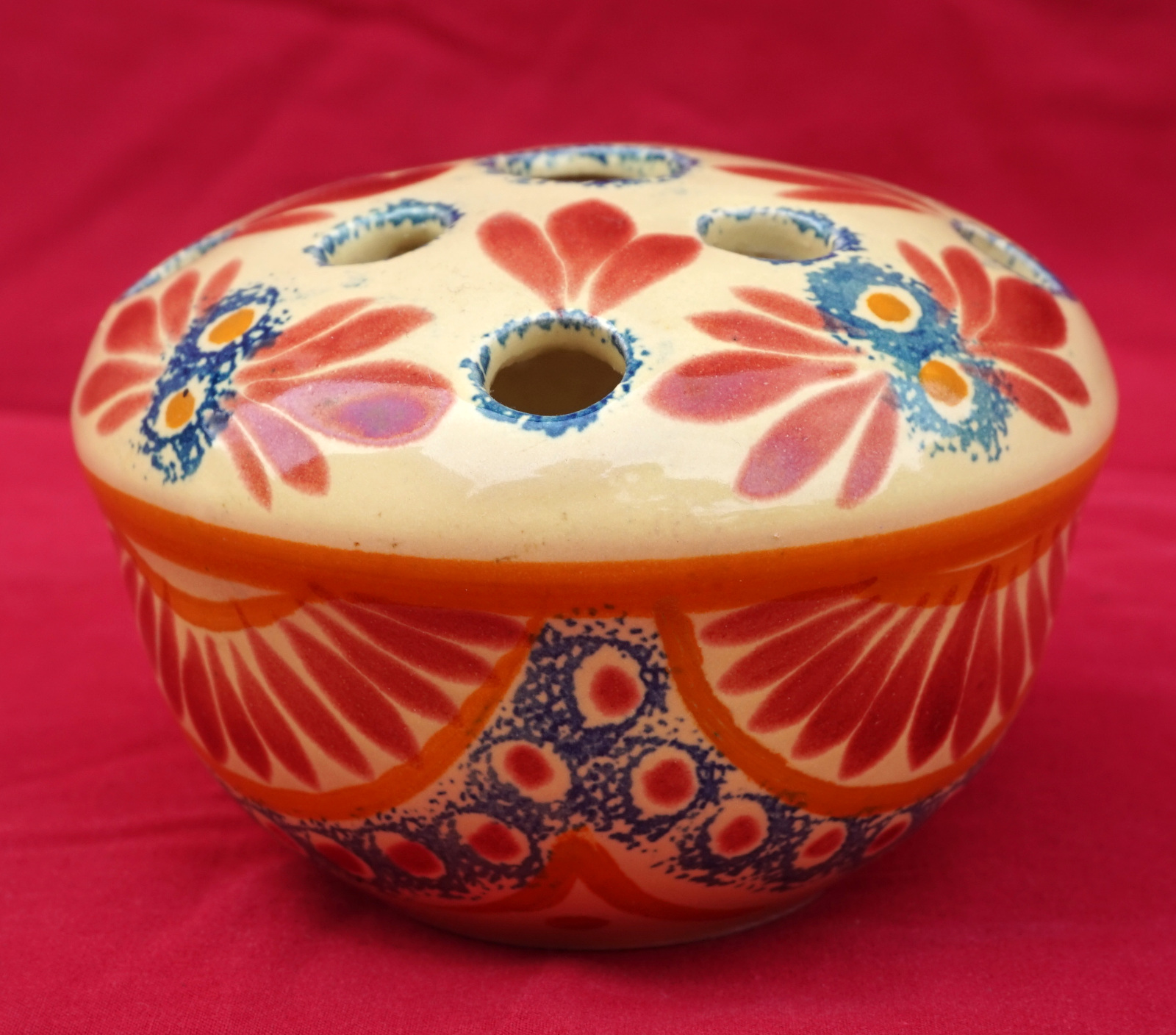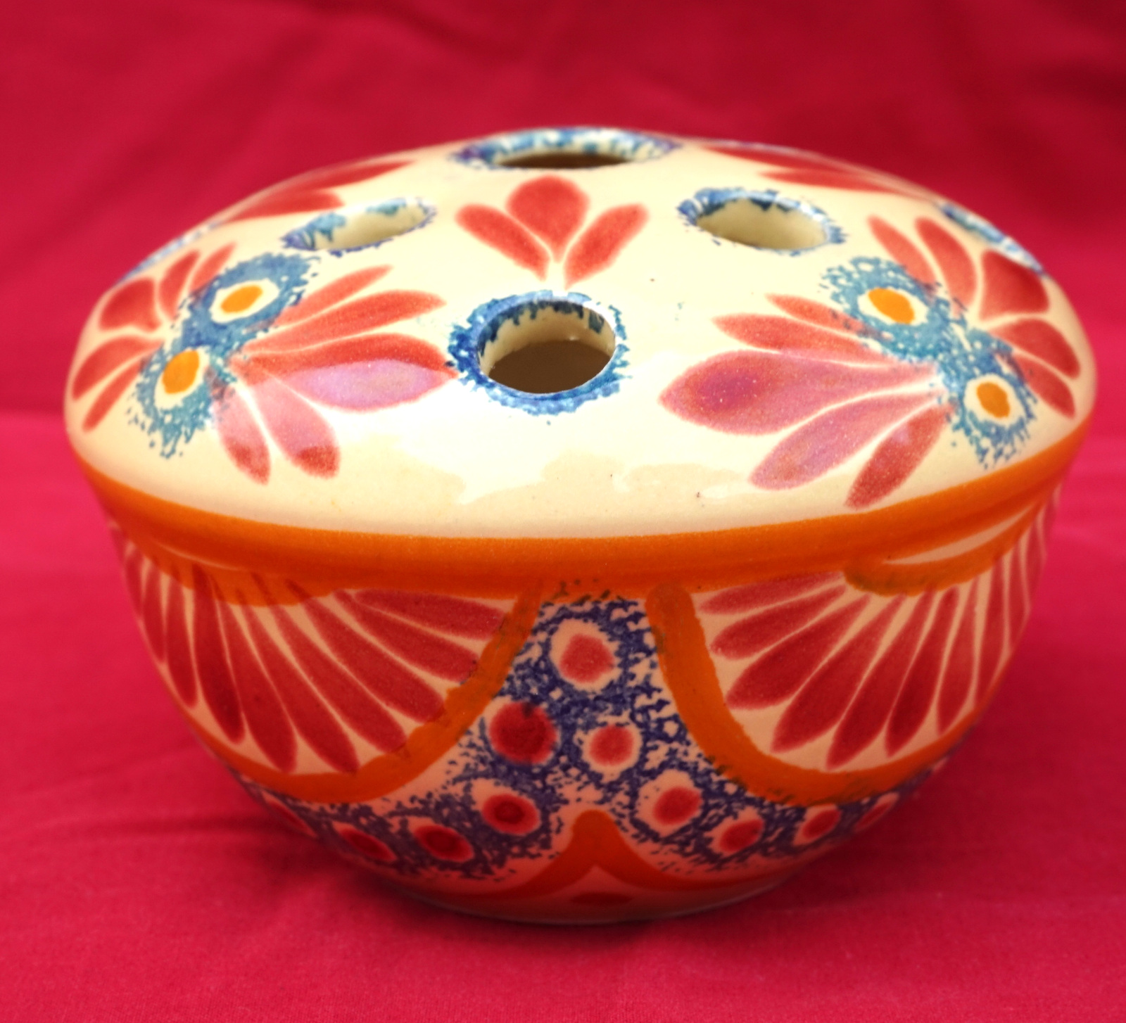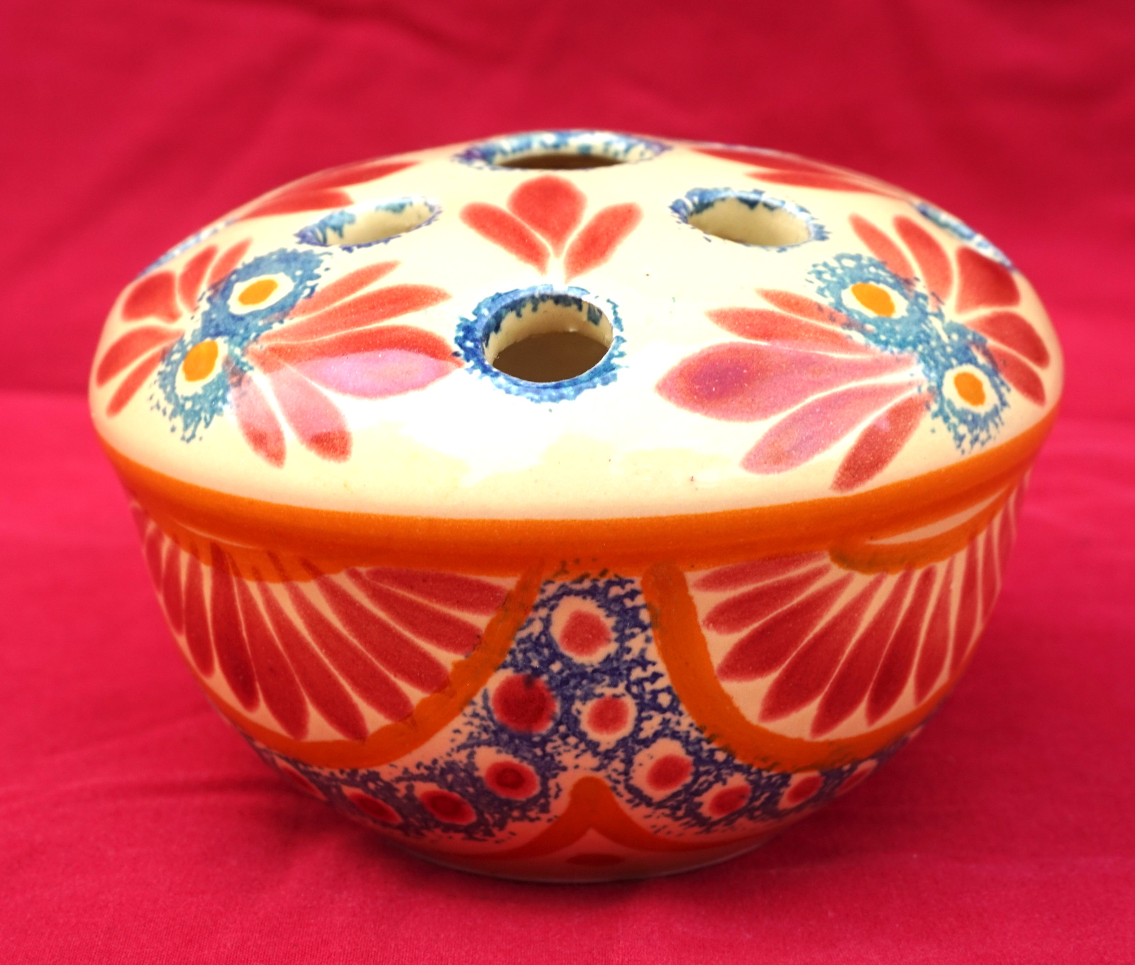 French hand painted faience flower frog top ball vase made by Henriot Quimper during the 1940's. It's signed on the bottom. 4 1/4" (11cm) diameter, 2 3/4" (7cm) height. Perfect condition