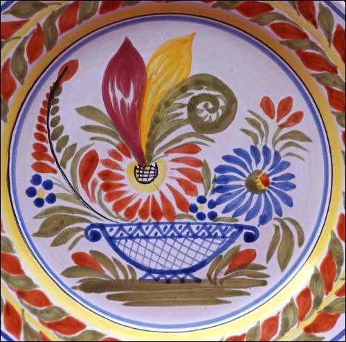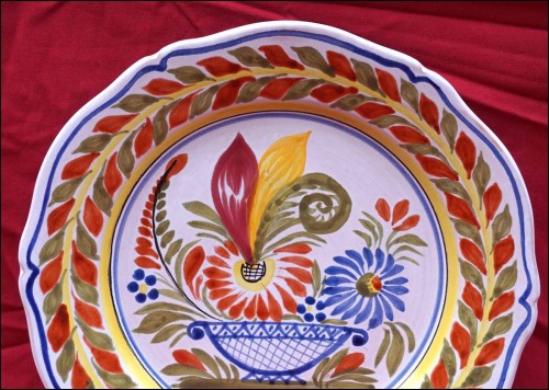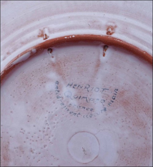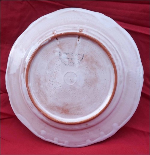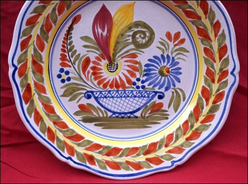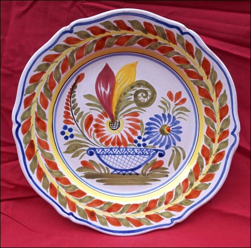 Vintage french hand painted faience decorative plate made by Henriot Quimper during the 1970's. It's signed on the back with 2 holes for hanging. 9 5/8" (24.5cm) diameter. Perfect condition as shown by the following pictures.