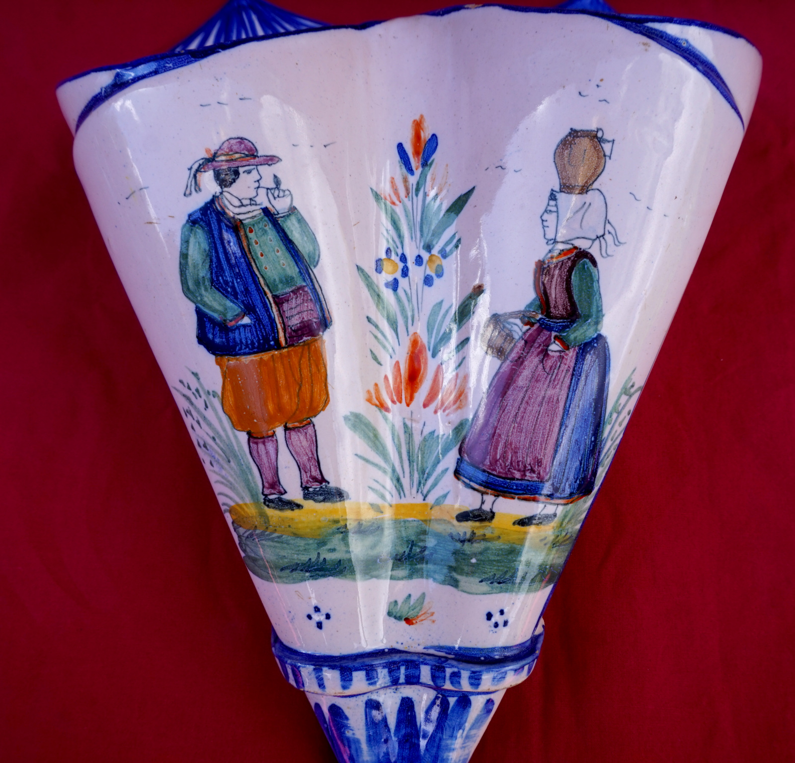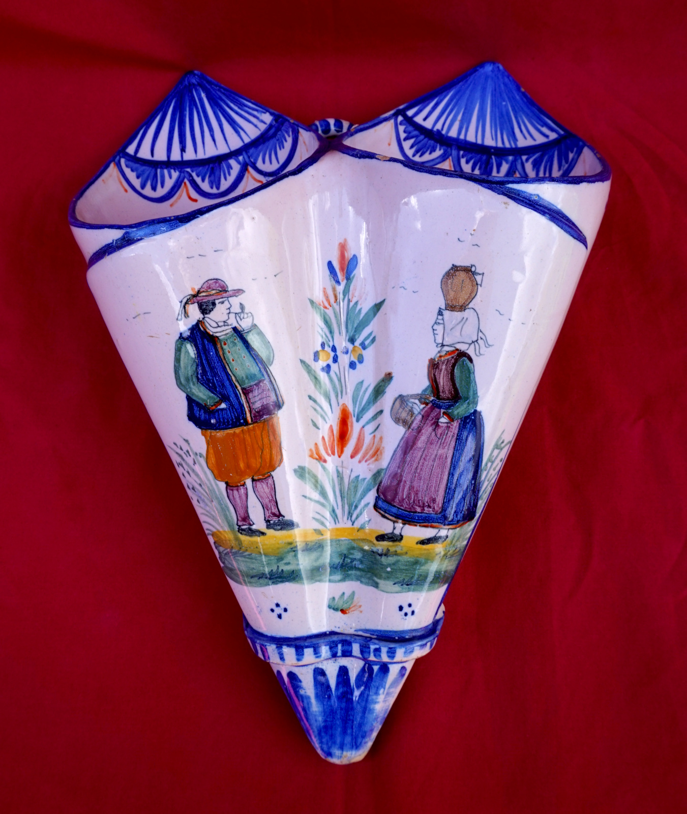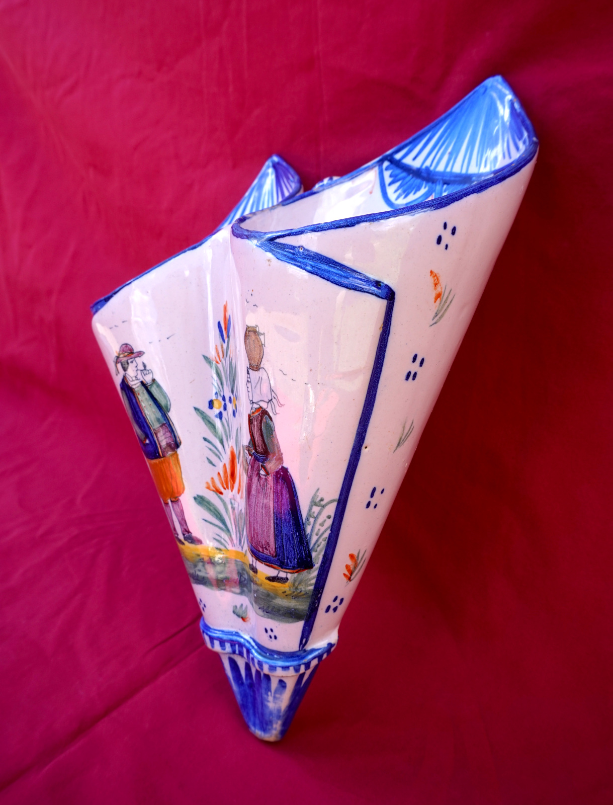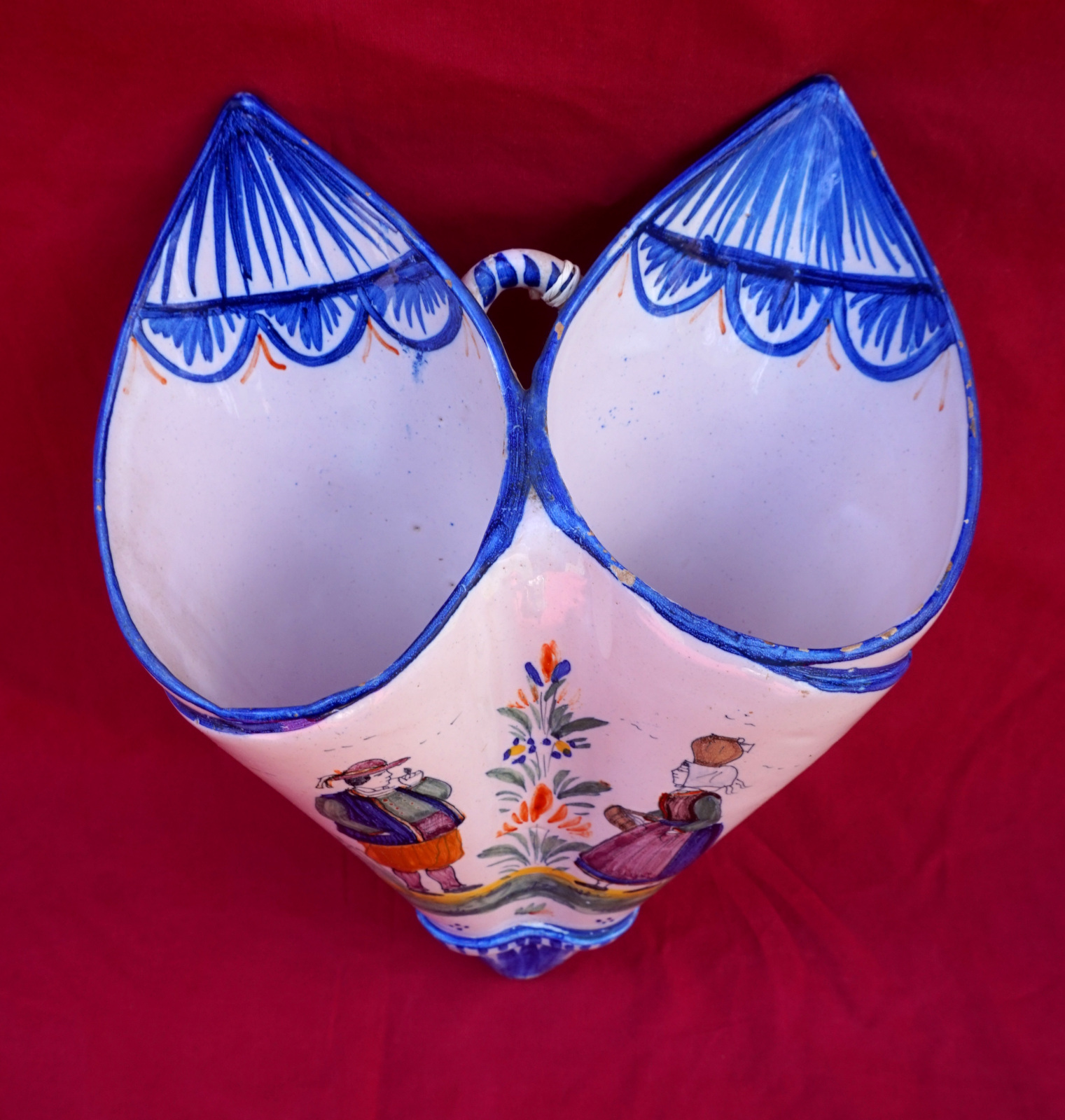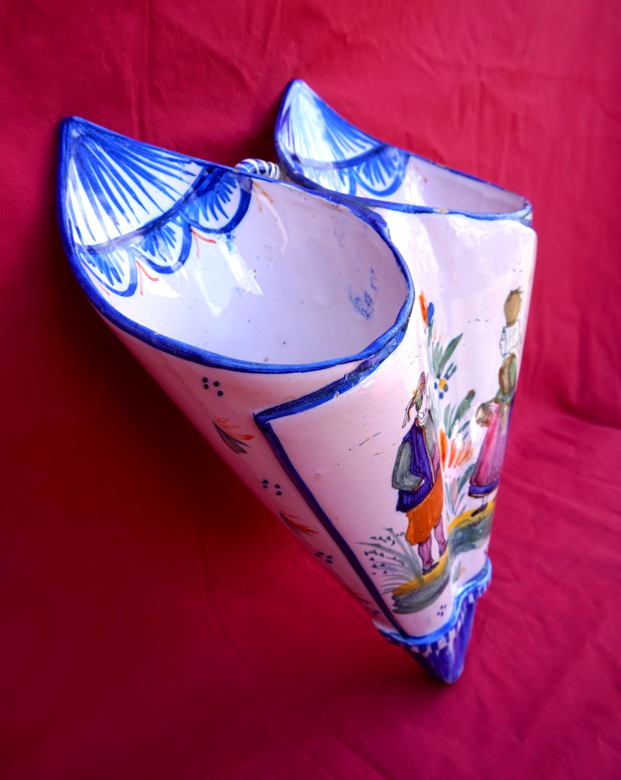 Double cornet mural en fiaence peinte à la main d'un couple de Bretons, manuifacture Henriot vers 1910. Il est signé sur son fond. Hauteur 25.5 cm, largeur 19 cm, profondeur 7.5 cm. Parfait état.