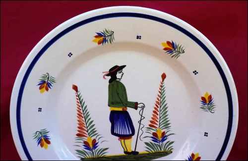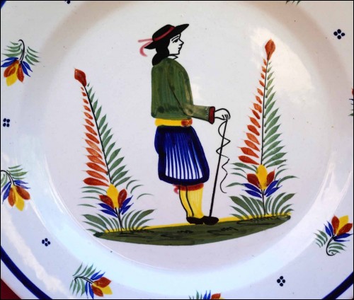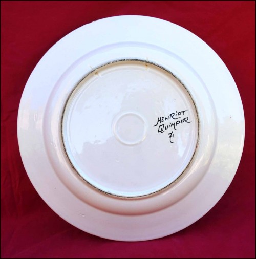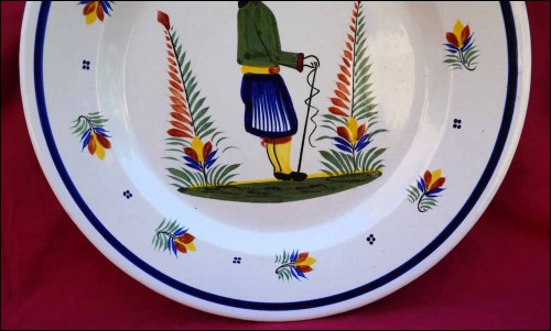 French hand painted faience large round dish showing a little breton made by Henriot Quimper. 12 5/8" (32cm) diameter. It's signed on the back. Perfect condition.