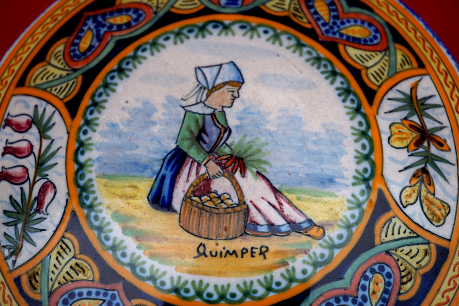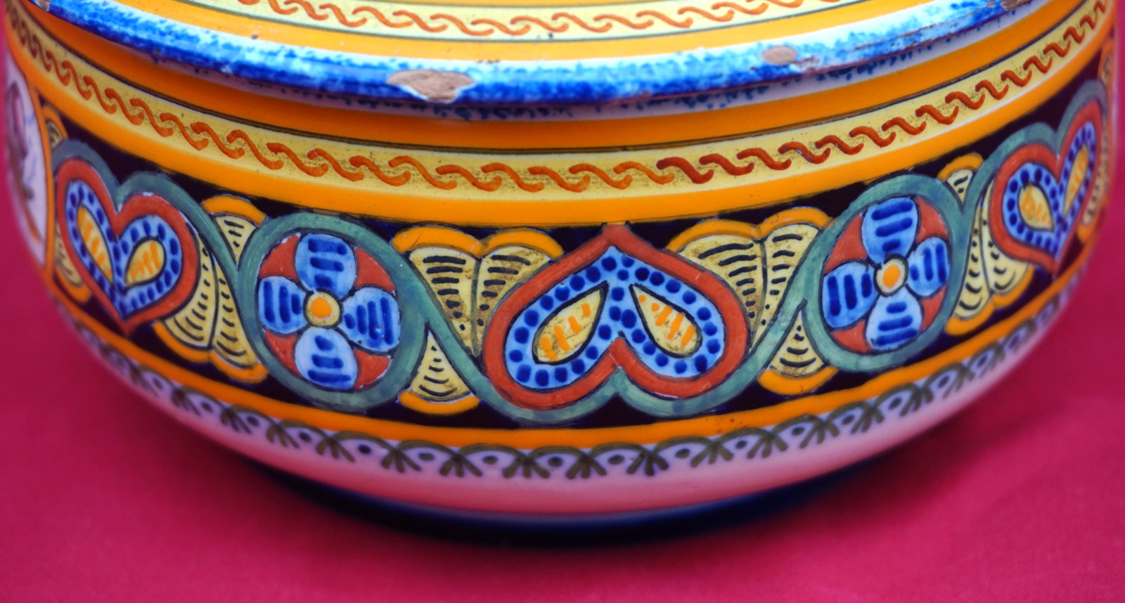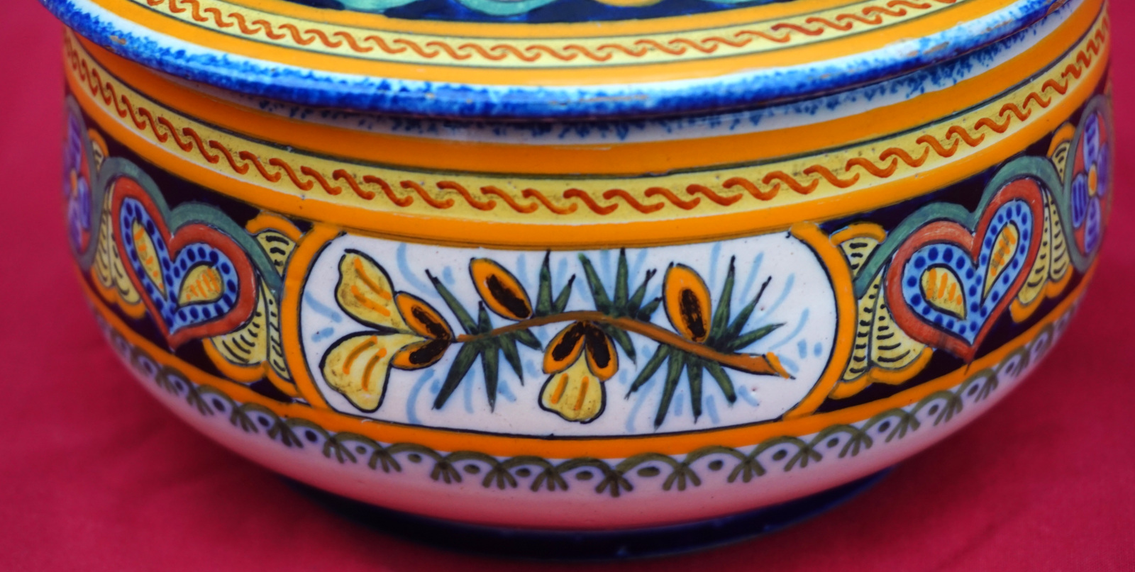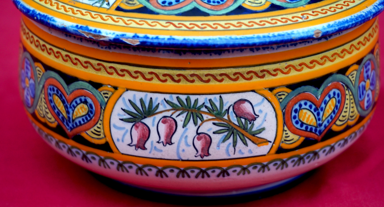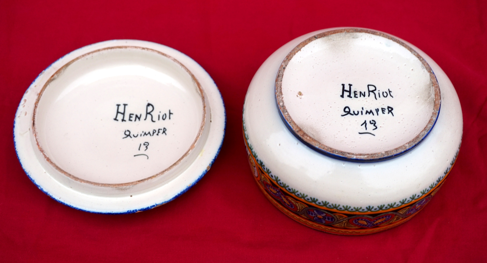 Boite en céramique peinte à la main d'une bretonne par Henriot Quimper début XXème siècle. Elle est signée sur son fond et dans le couvercle. Diamètre 13.5 cm, hauteur 8.5 cm. Bel état, quelques manques d'émail sur le bord.