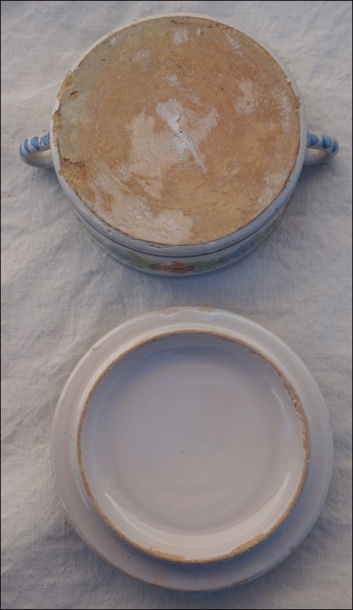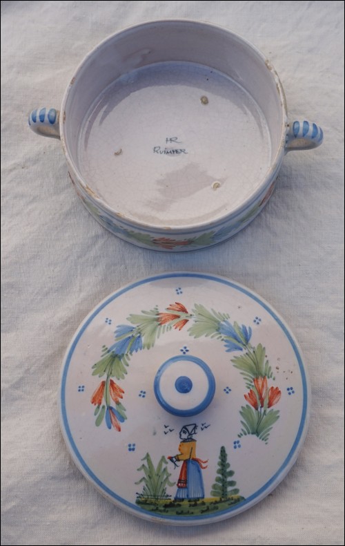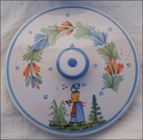 French hand painted faience covered candy or trinket lidded box made by HR in Quimper late 19th century. The hand painted decor shows a little bretonne in her garden. 5 1/8" diameter 3" height. Signature inside. Good condition some small enamel wear as presented on the following pictures.