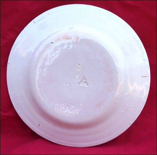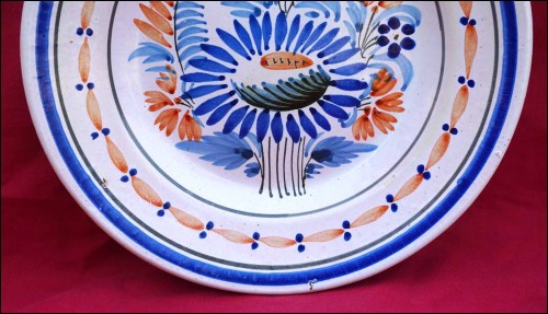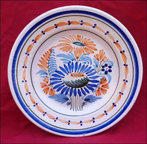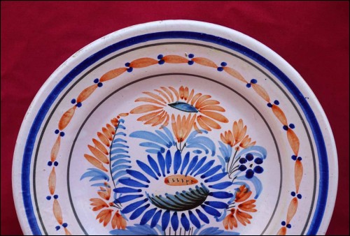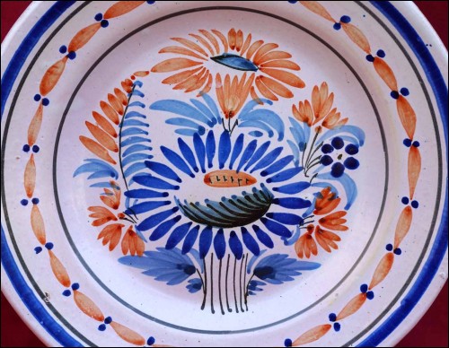 French hand painted faience plate showig dahlias in orange and blue made by La Hubaudière in Quimper late 19th century. It's stamped on the back. 9" (23cm) diameter. Perfect condition as shown by the following pictures.