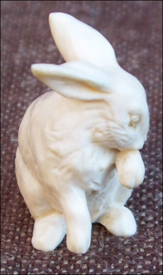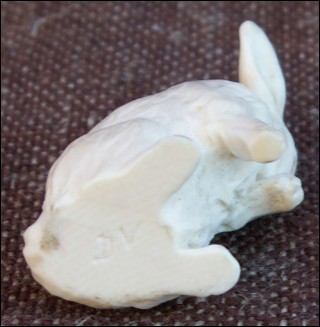 For our French-speaking friends Lapin en fossile de morse sculpté à la main et signé DV, Allemagne. Hauteur 3 cm.