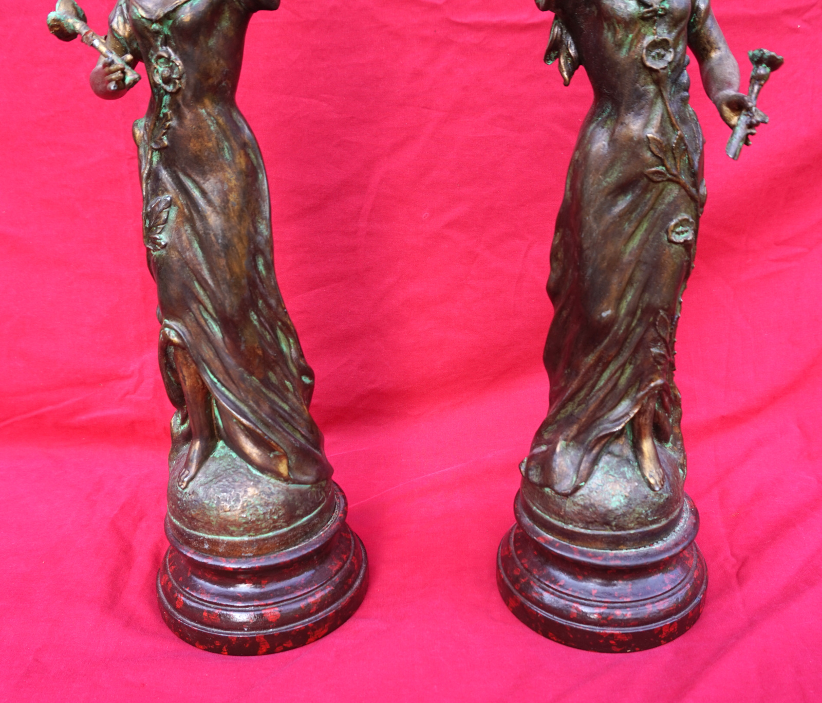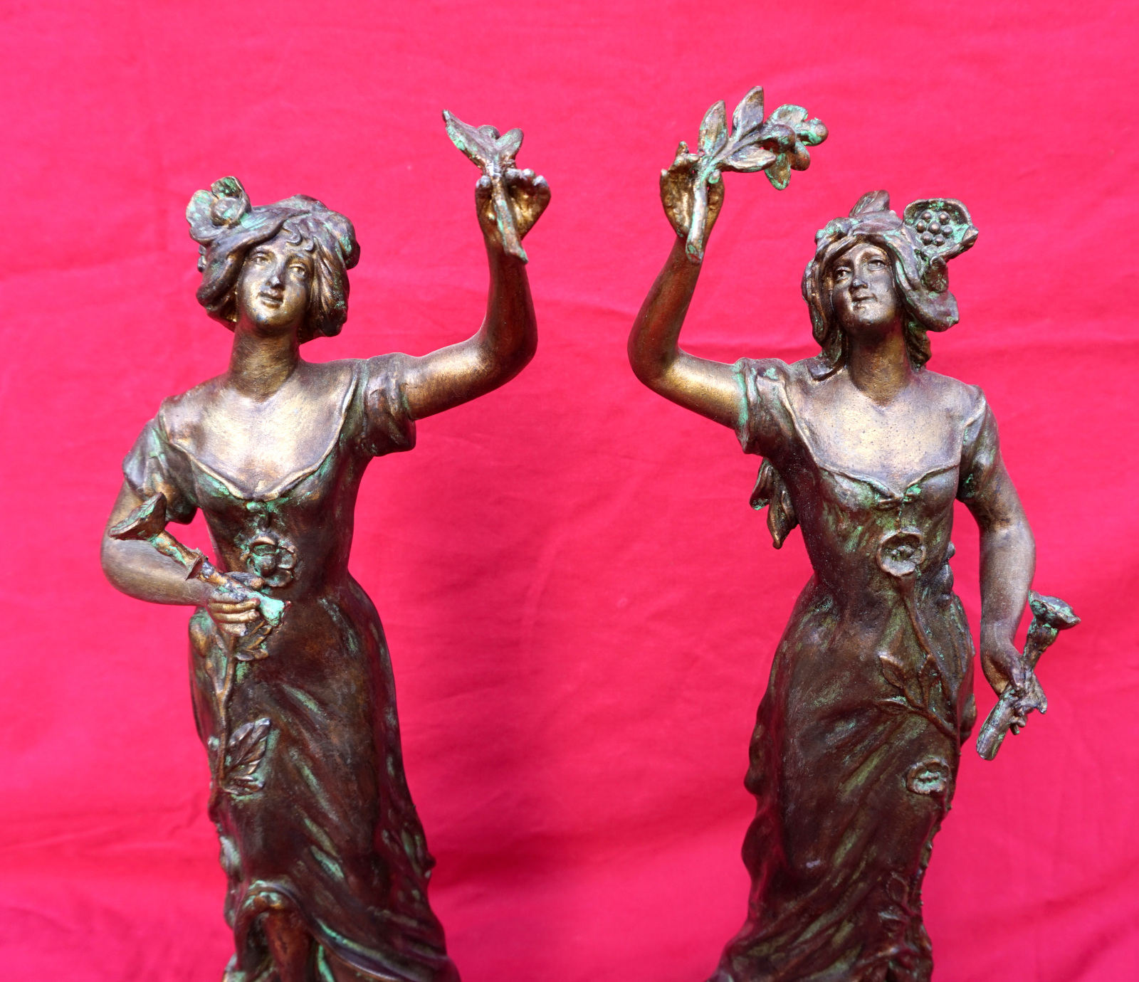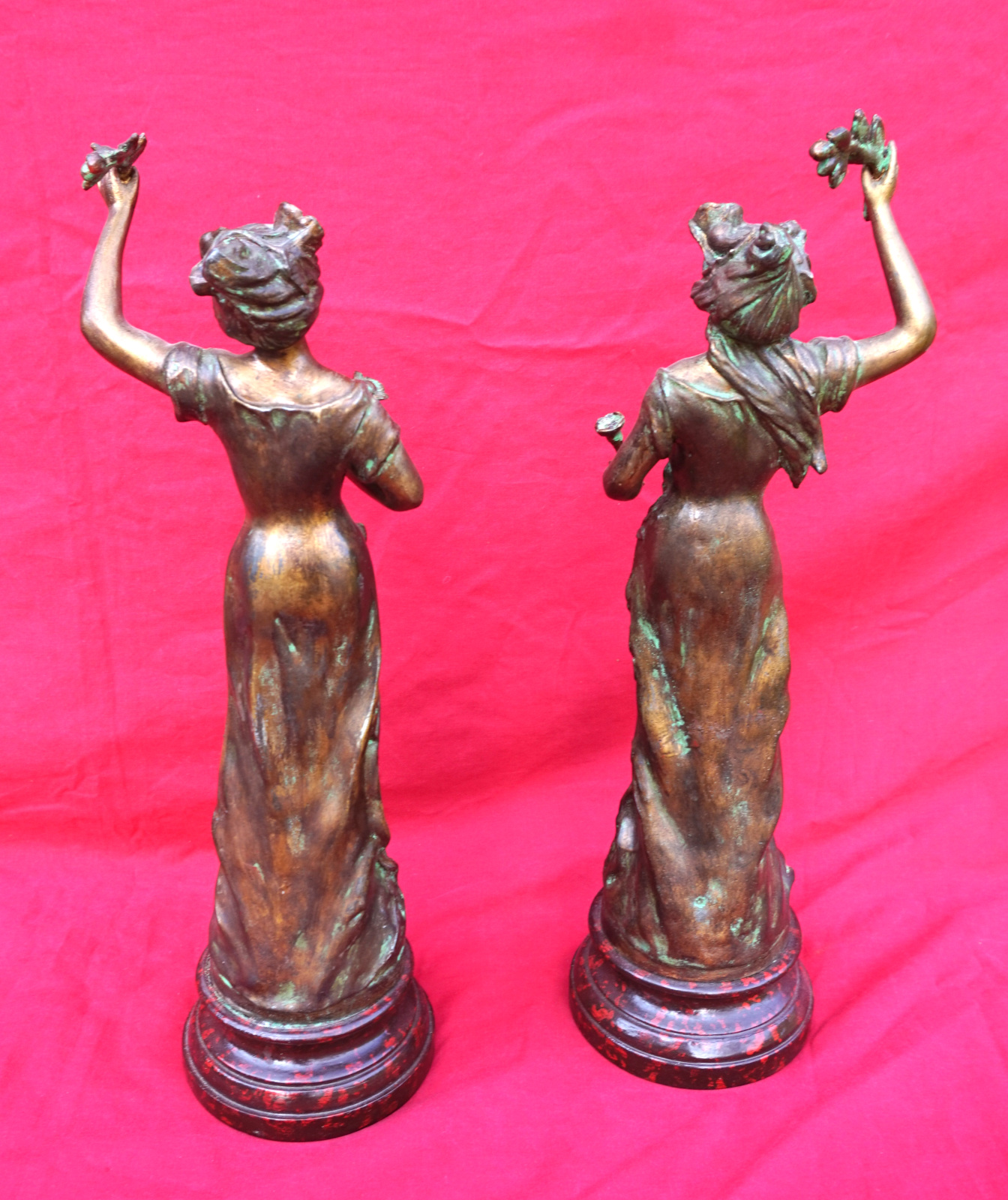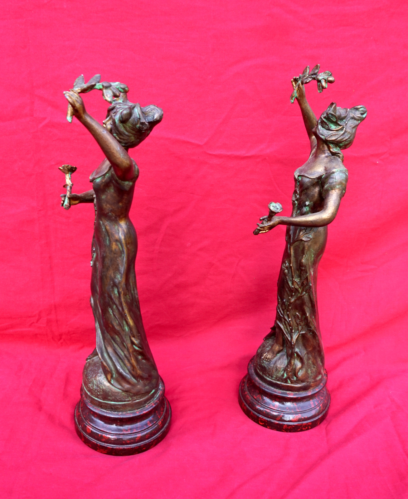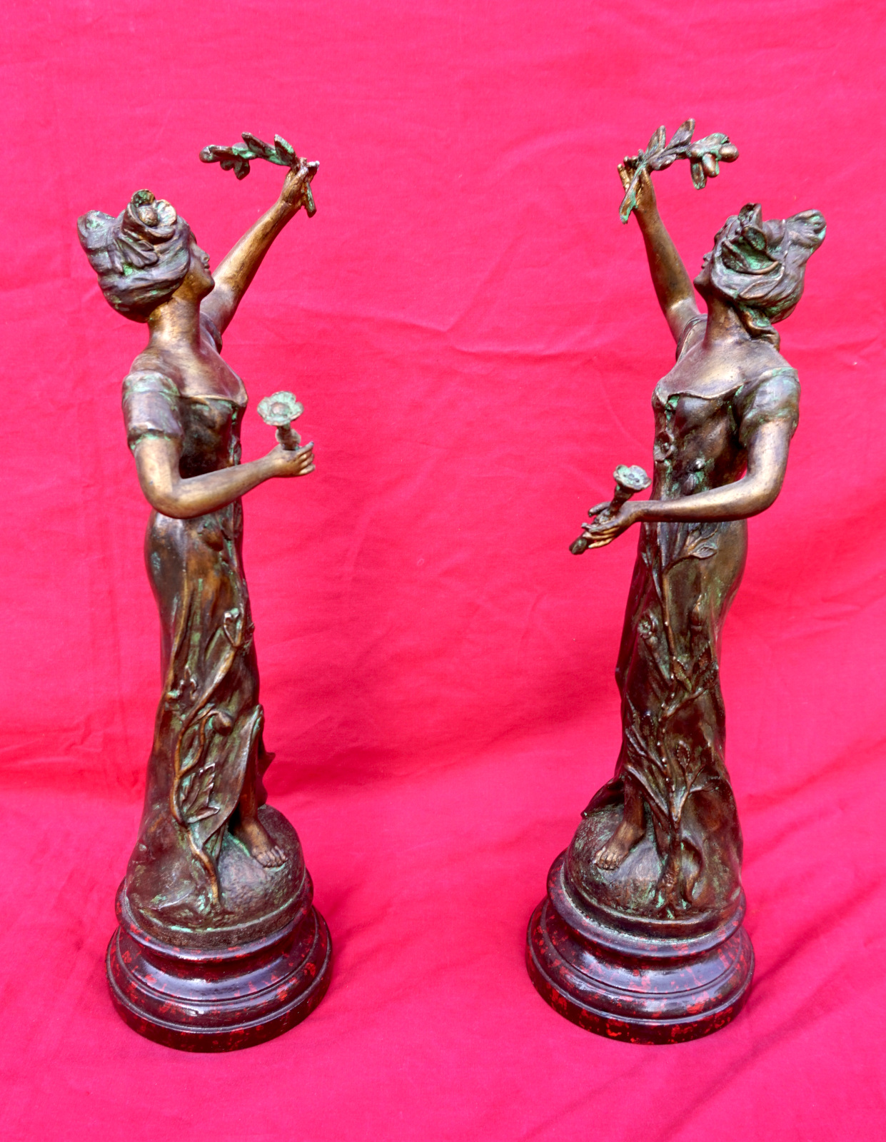 French Art nouveau pair of Flora Ladies sculpture in spelter made by Charles Ruchot (1871-1954) early 20th century. They are signed on the base. 16" (40.7cm) total height with the wooden base, 4 3/4" (12cm) diameter to the base, weight of the pair 5lb 12oz (2.6kilograms). Beautiful condition.