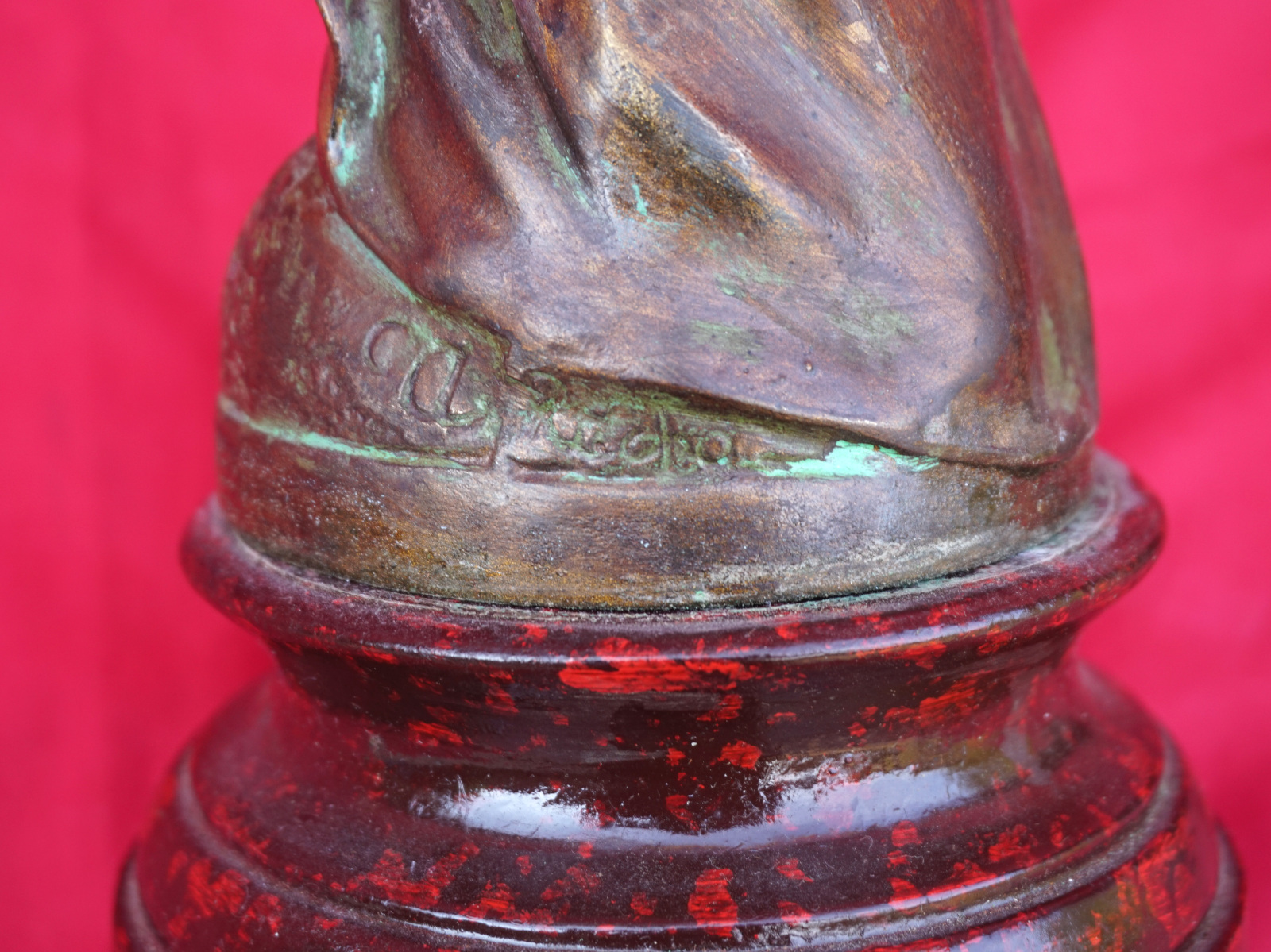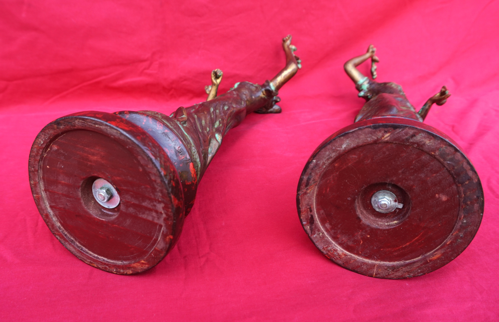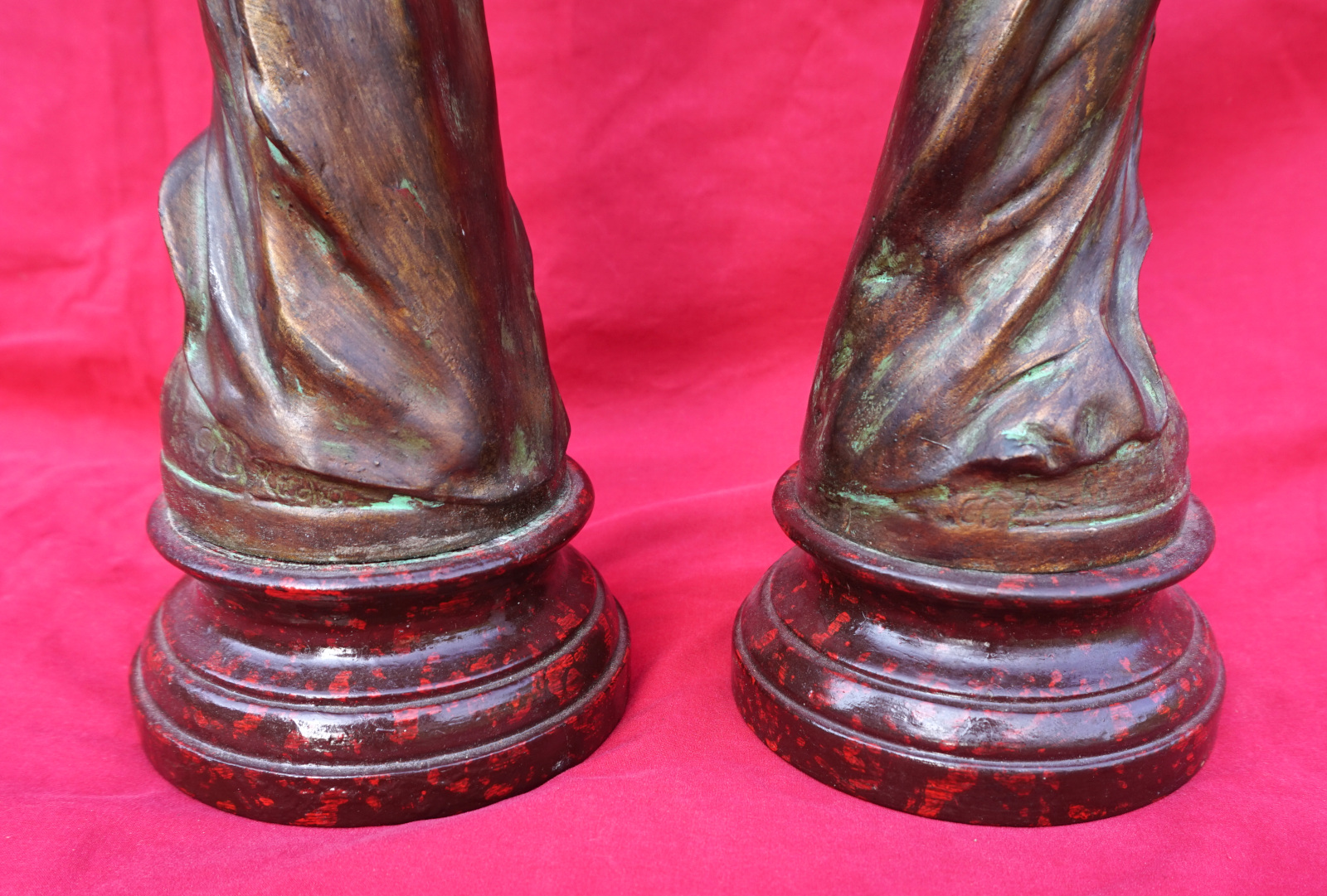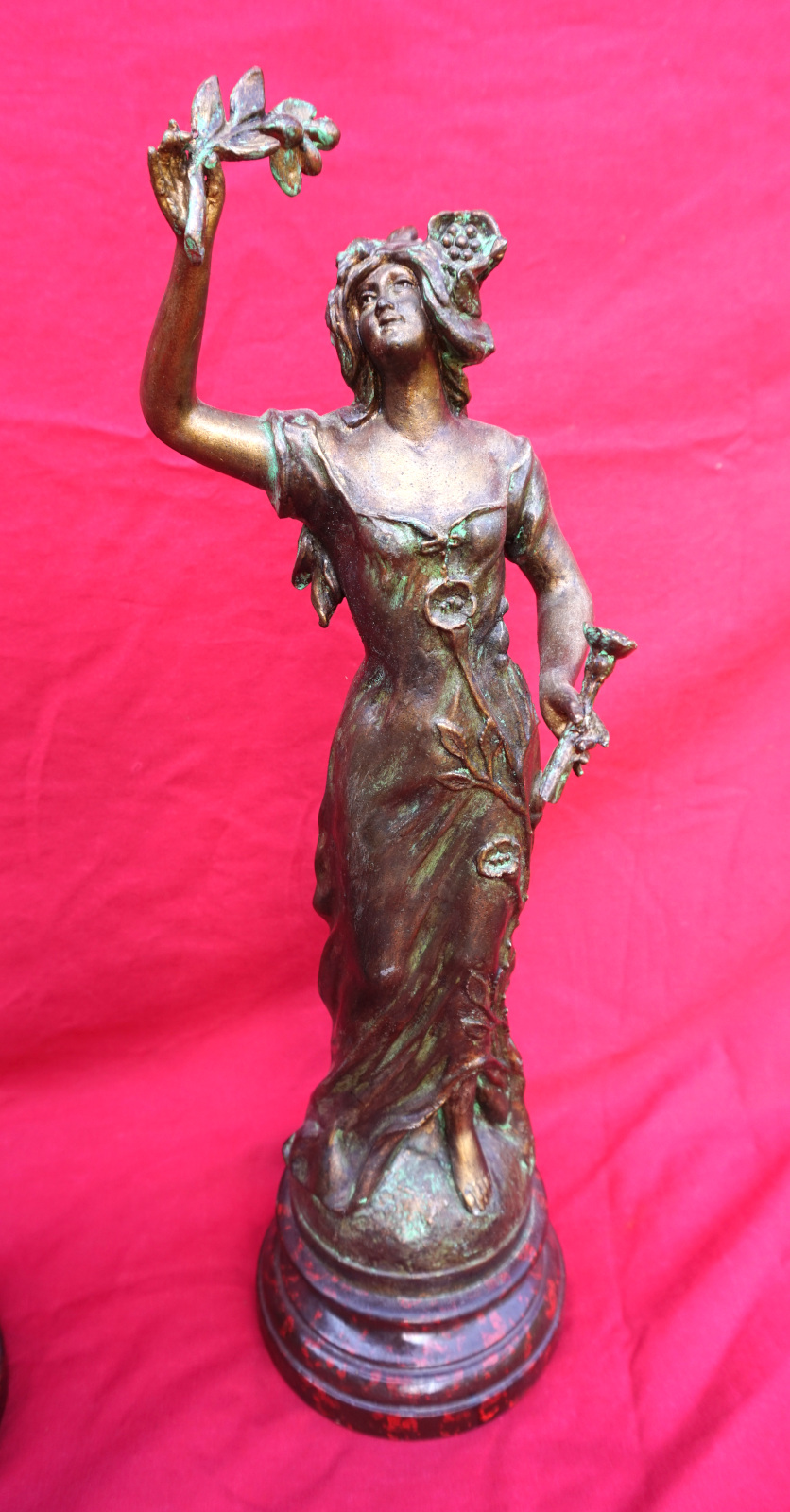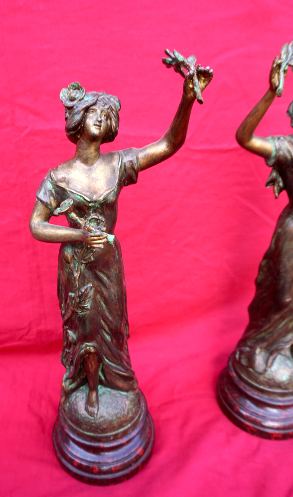 French Art nouveau pair of Flora Ladies sculpture in spelter made by Charles Ruchot (1871-1954) early 20th century. They are signed on the base. 16" (40.7cm) total height with the wooden base, 4 3/4" (12cm) diameter to the base, weight of the pair 5lb 12oz (2.6kilograms). Beautiful condition.