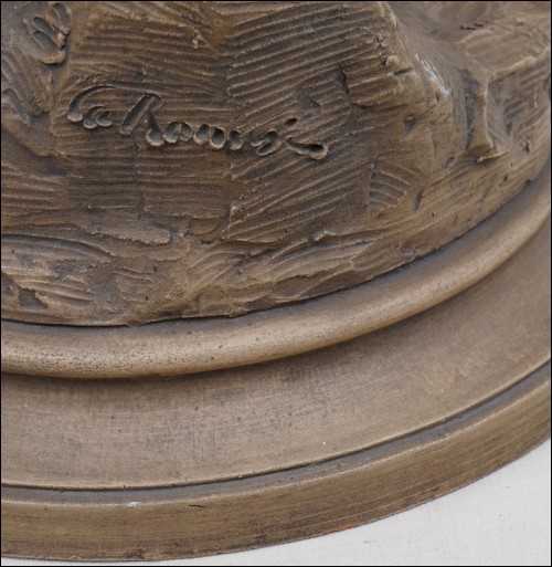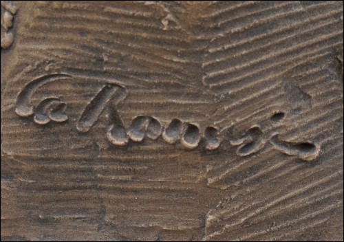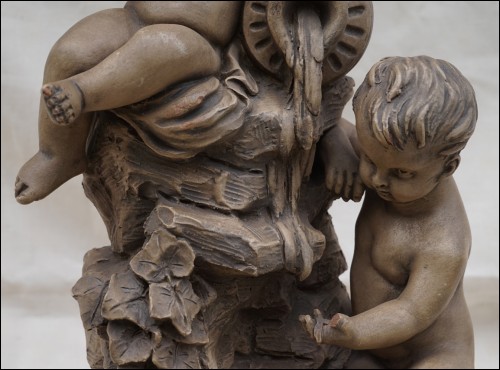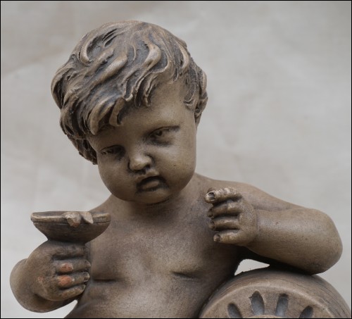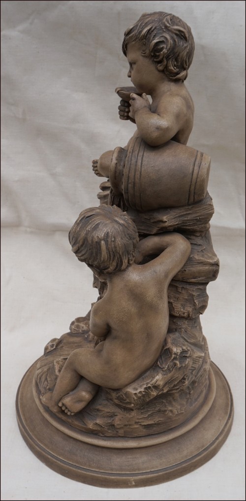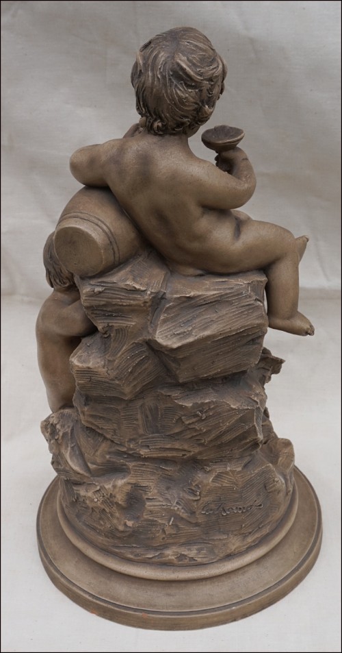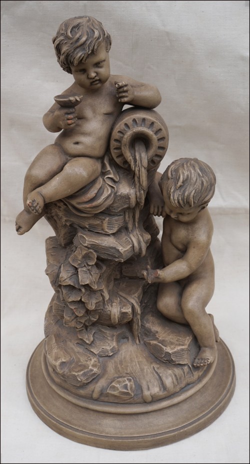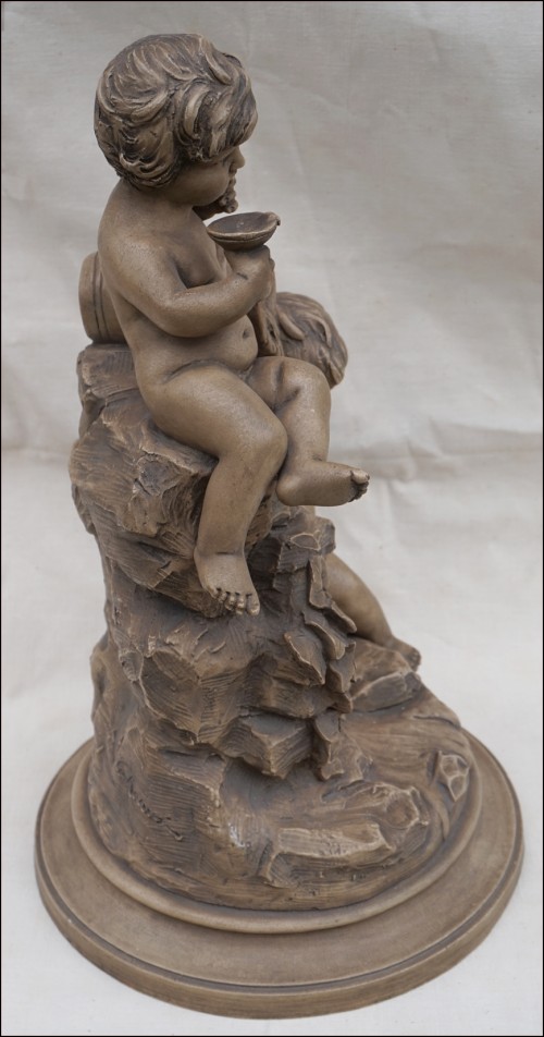 The Source statue, terracotta with beautifull patina, showing 2 cherubs on a rock made by Rossini during the 1920's. Good condition only a thumb of one cherub is broken. Signed on the back. 18 1/8" height 10 1/2" diameter to the base.
