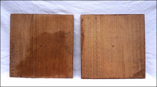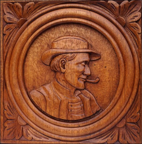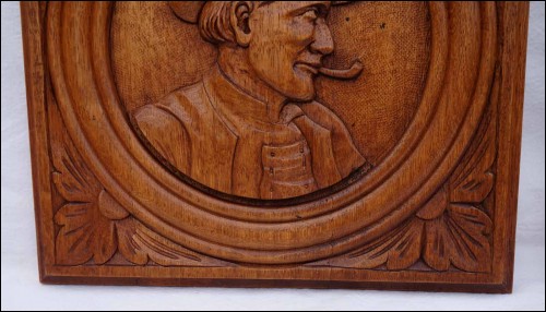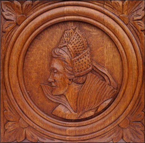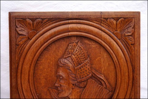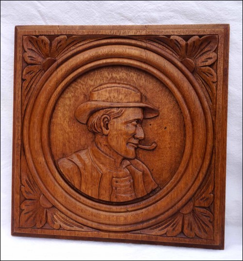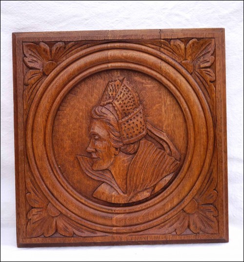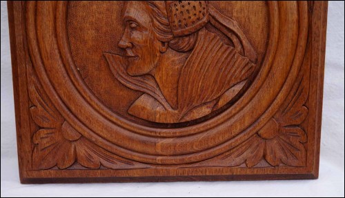 Paire de panneau en bois de chêne sculpté, représentant un couple de breton en médaillon, vers 1950. Dimensions: 33 cm par coté. Très bel état.