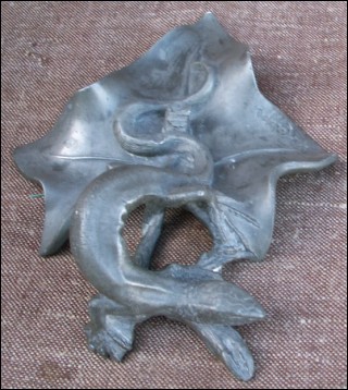 Lézard sur une feuille de lierre de Henri HUPPE en étain. Signé H. Huppé. Fondeur Ettinger Frères. Un manque. Largeur 13,8 cm, longueur 18 cm.