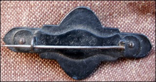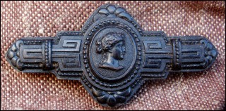 Old french wooden brooch with Eugenie Empress in medallion made during the 1860's. Good condition. 1 3/8" high 2 3/4" width.