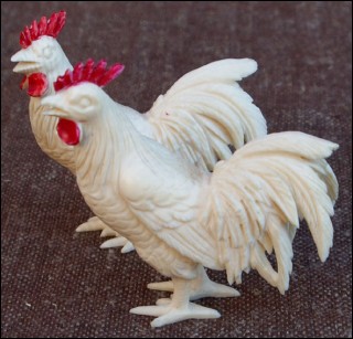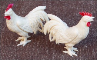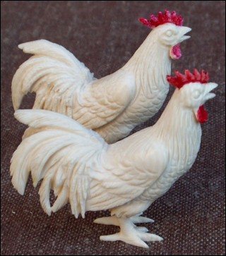 For our French-speaking friends Paire de coq en os de mammouth sculpté à la main, école de sculpture allemande. Hauteur 5.2 cm, longueur 6.2 cm.