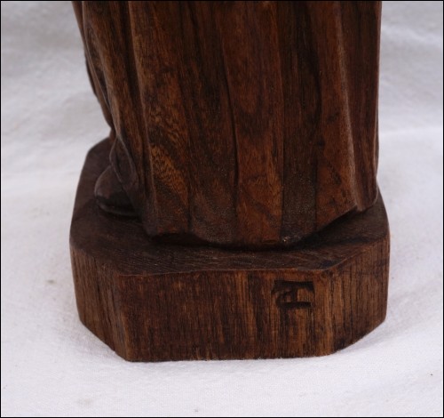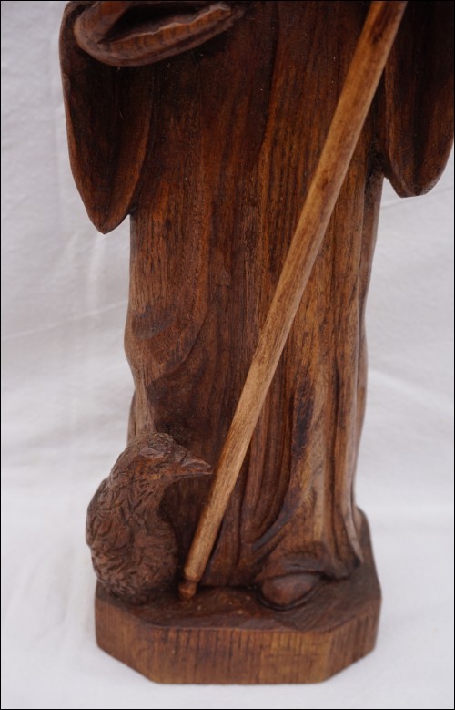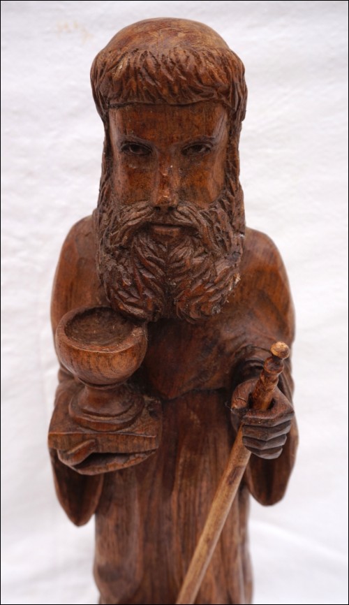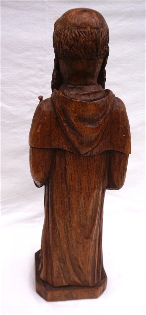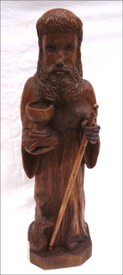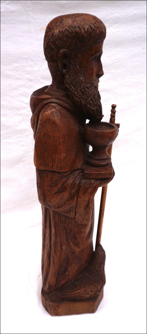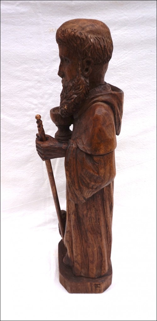 St Jean L'Evangéliste , sculpture sur bois par Daniel Théotec. Hauteur 43.2 cm, largeur à la base 11.5cm, profondeur 10.2 cm. Signé du monogramme sur la base. Très bel état.