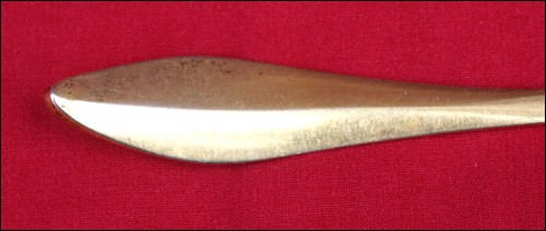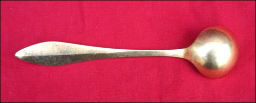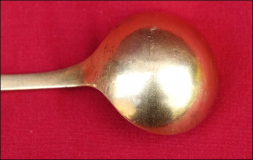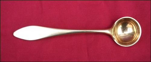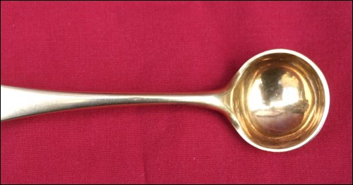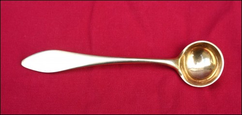 French Empire gold plated sterling silver mustard spoon/laddle serving made during the 1810's. It's hallmarked with the french sterling silver guarantee (.925). 4 1/2" (11.6cm) length, 1" (2.5cm) diameter, weight 18 grams. Good condition slightly used on the gold plated as shown by the following pictures.