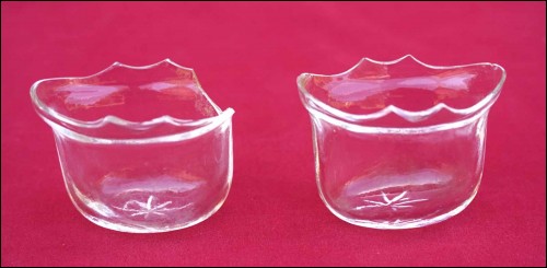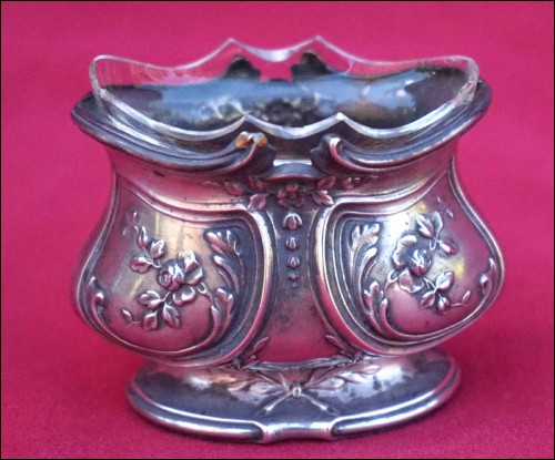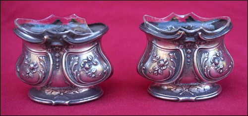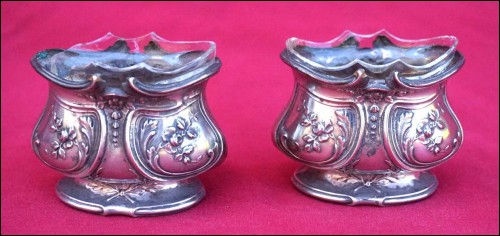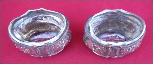French sterling silver pair of open salt cellars Louis XV styme made during the 1900's. Theyr are hallmarked with the head of Minerva, french sterling silver (.925) guarantee. 1 3/4" (4.4cm) height, 2 1/8" (5.5cm) width, weight 1.622 oz (46grams). Good condition one inside glass cellar is damaged as shown by the following pictures.