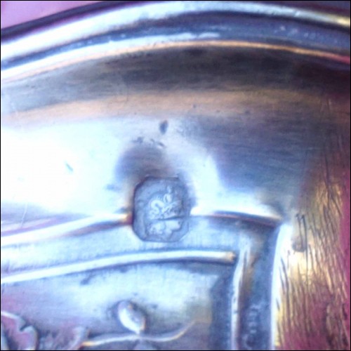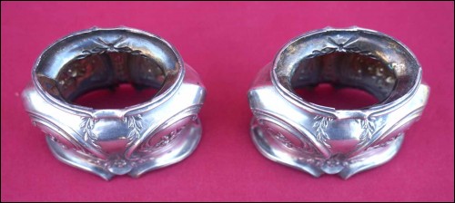Paire de salerons en argent massif de style Louis XV, époque Napoléon III . Ils sont estampillés à la Minerve 1° titre. Hauteur 4.4 cm, largeur 5.5 cm, poids 46 gr. Bel état, un intérieur en verre ébréché.