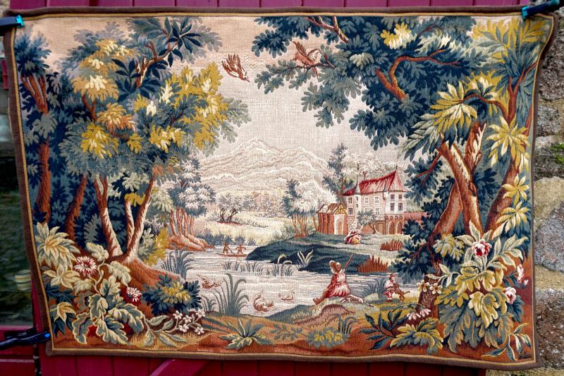 Tapestry River Landscape Aubusson Tapestry Vintage Signed 37 1/2" by 55"