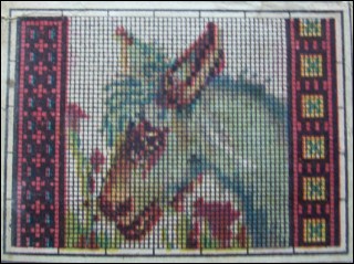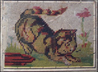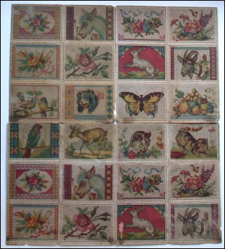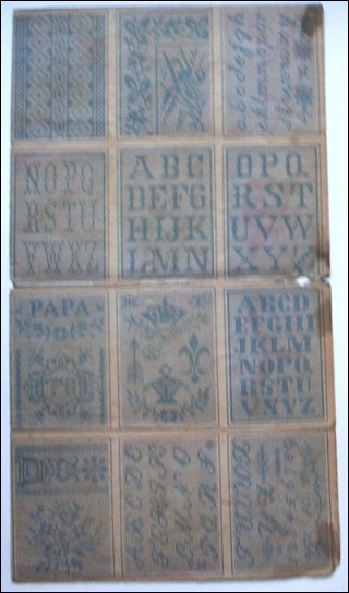 Exemple pour broderie en deux feuillets cartonnés, modèles pour imagiers et abécédaires au point de croix, XIXème siècle. Dans l'état. Dimensions de chaque feuille 32 cm par 17,8 cm.