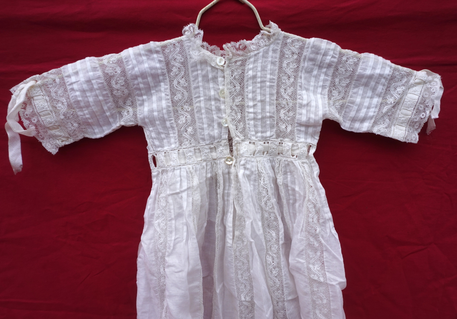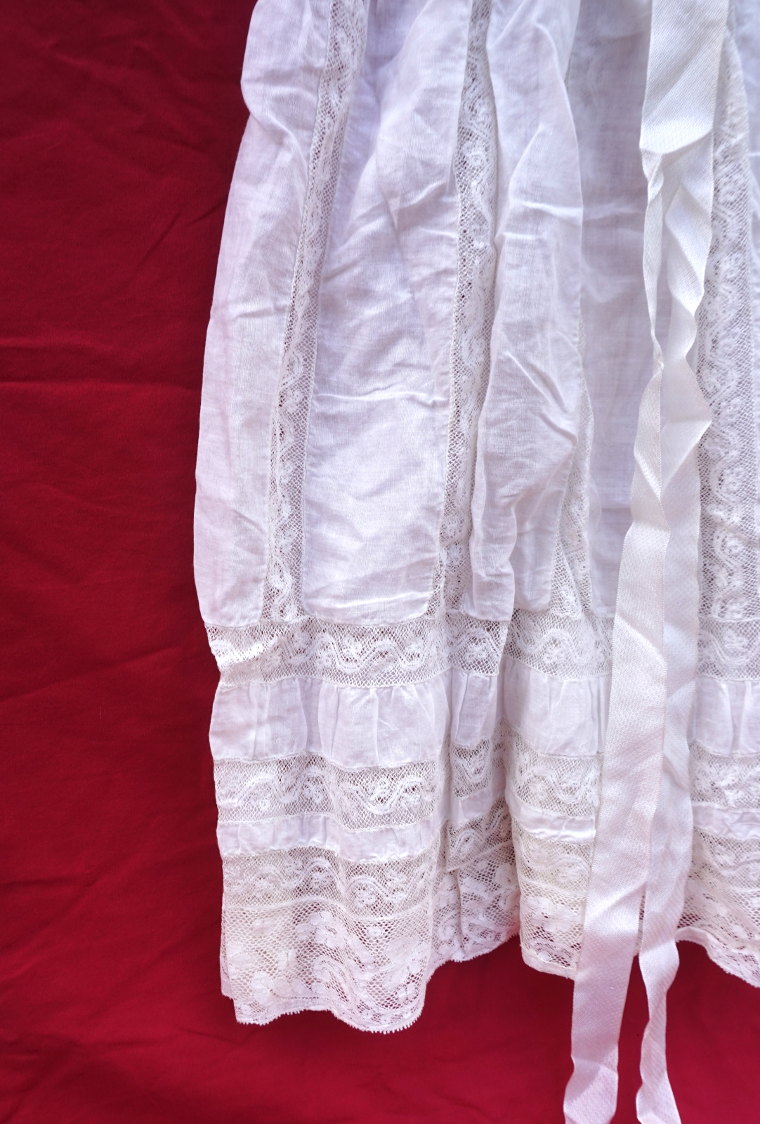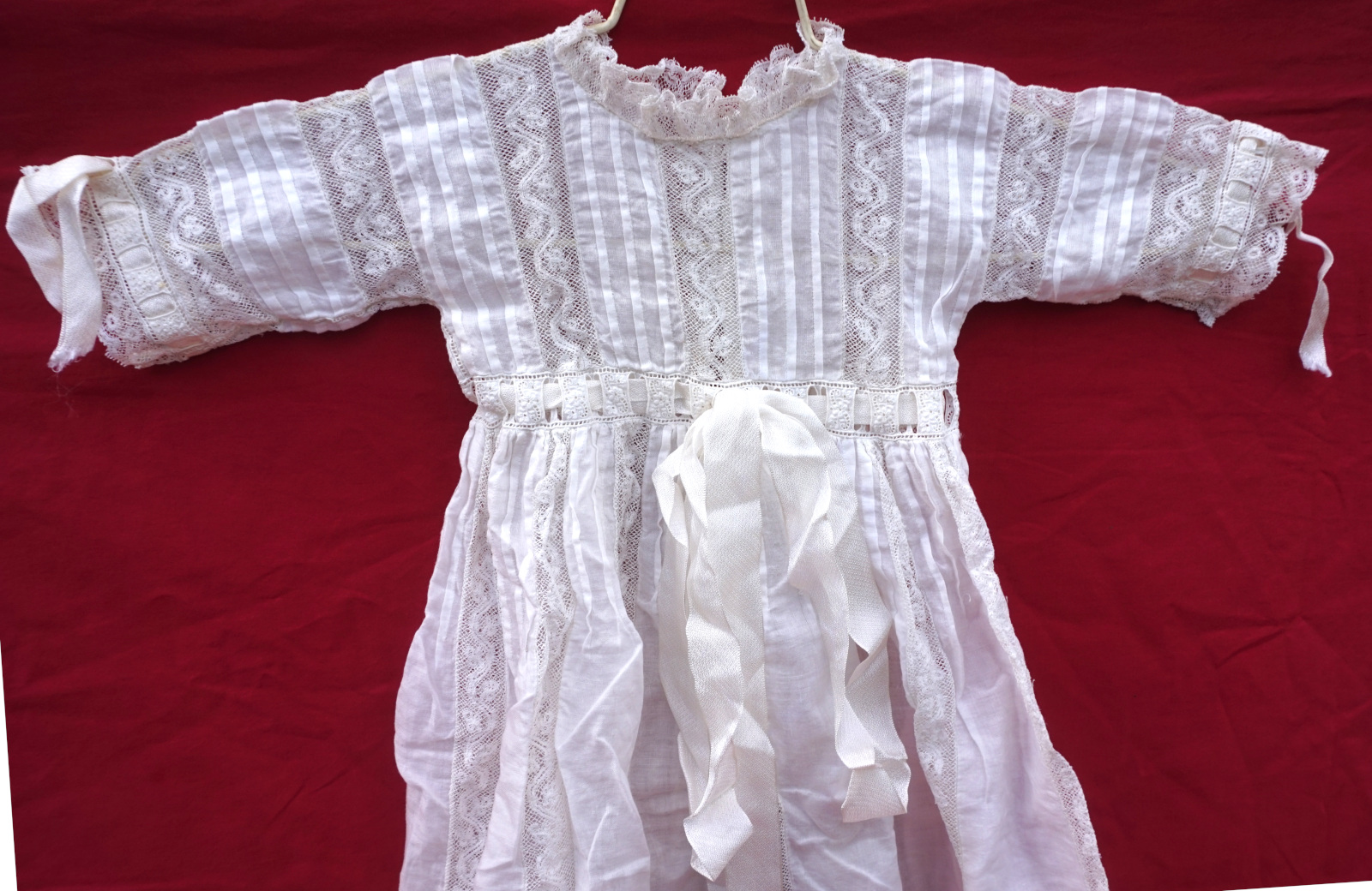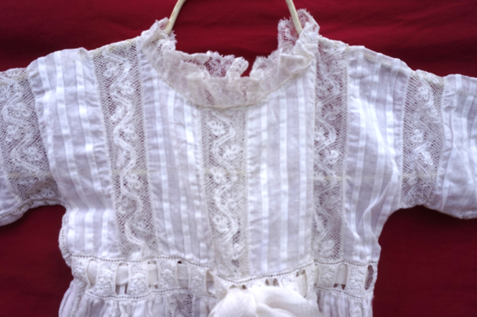 Robe de baptème en fil réhaussé de broderie vers 1900. Conviendrait pour habiller une grande poupée. Largeur aux épaules 21 cm, longueur 61 cm. Parfait état.