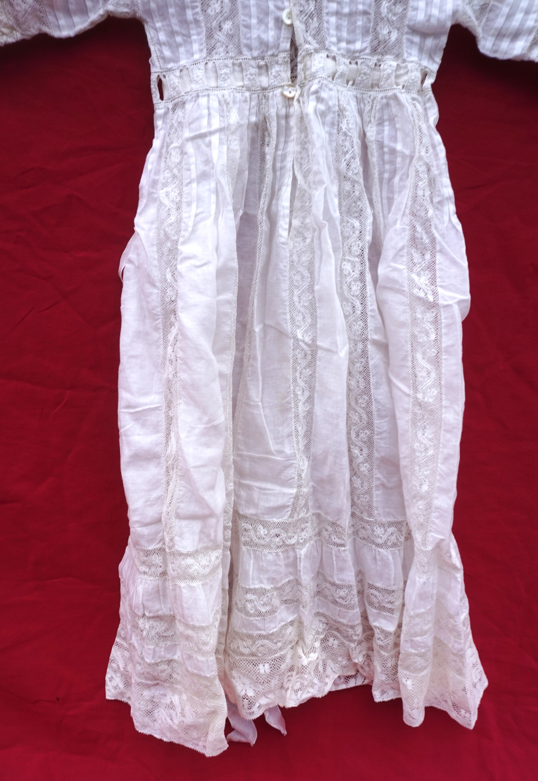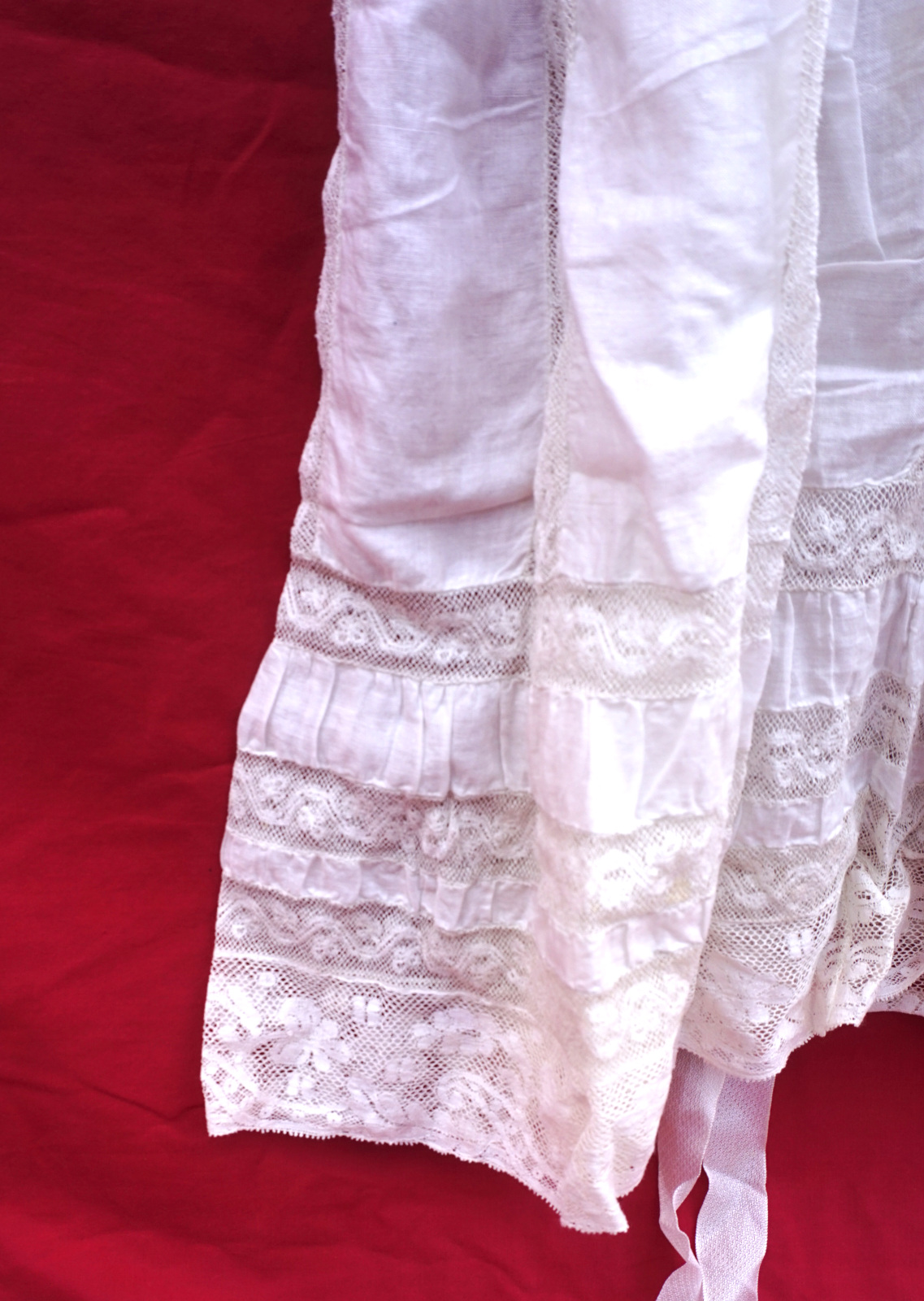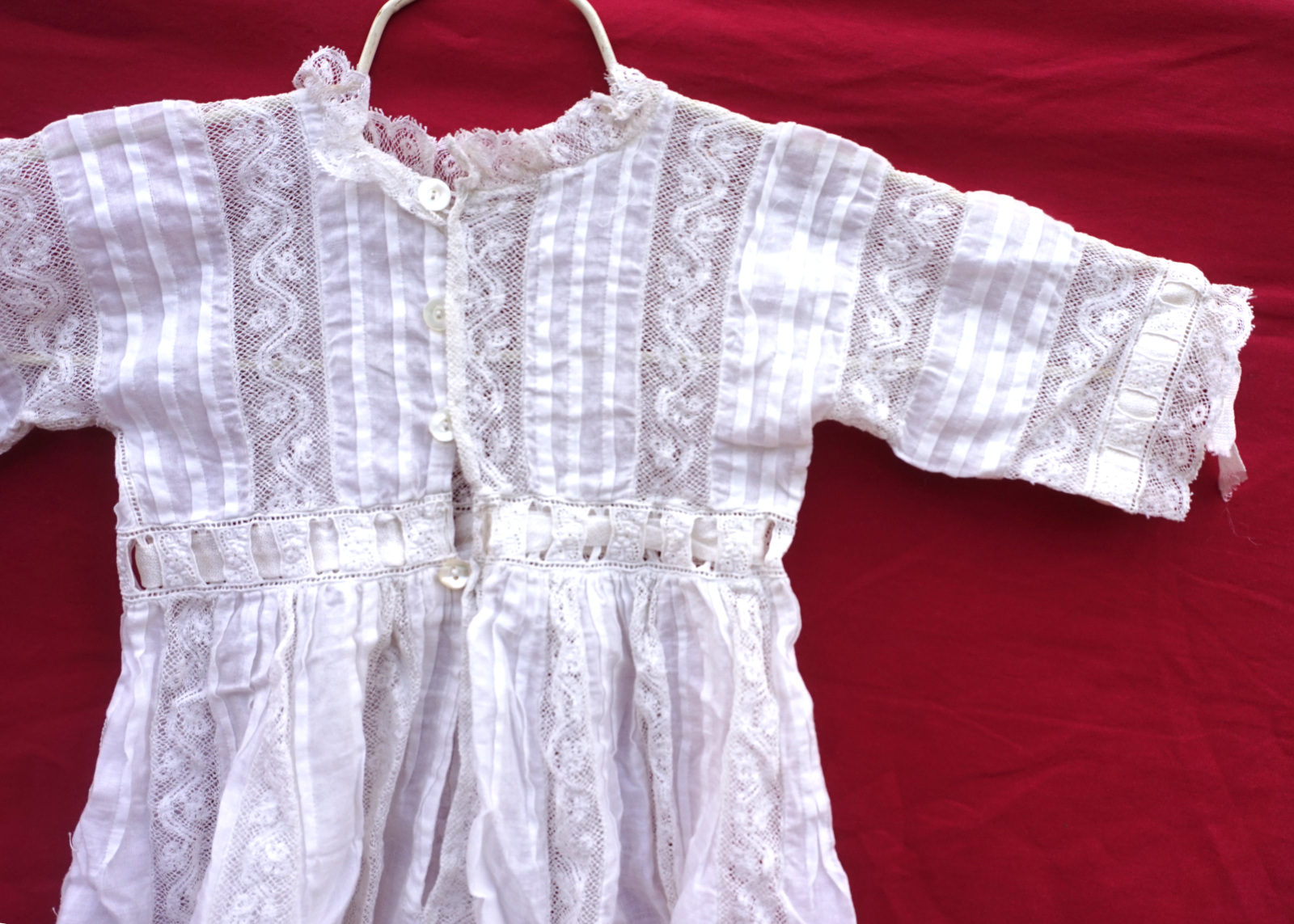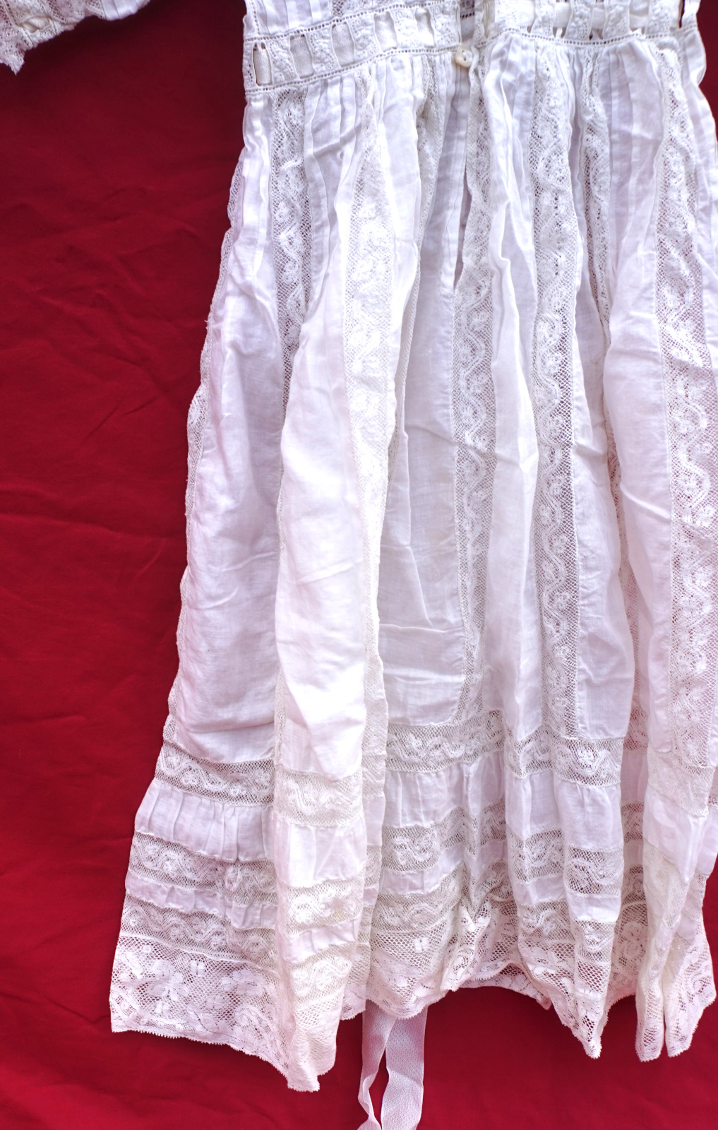 Robe de baptème en fil réhaussé de broderie vers 1900. Conviendrait pour habiller une grande poupée. Largeur aux épaules 21 cm, longueur 61 cm. Parfait état.