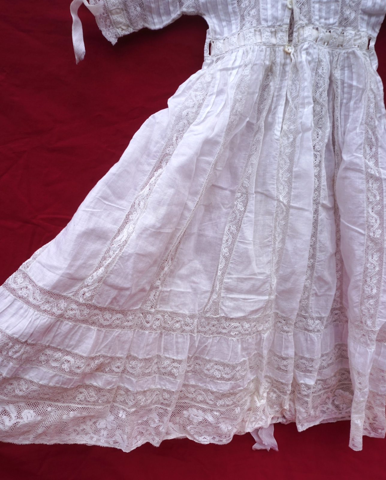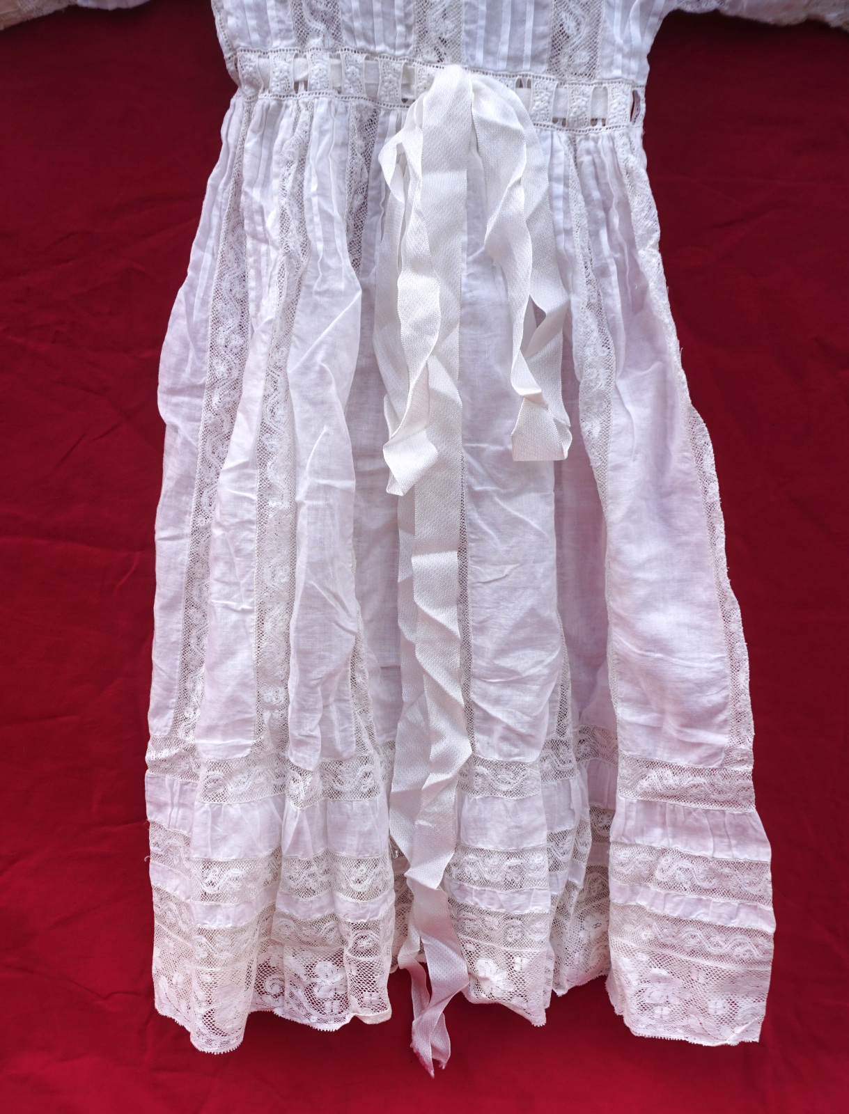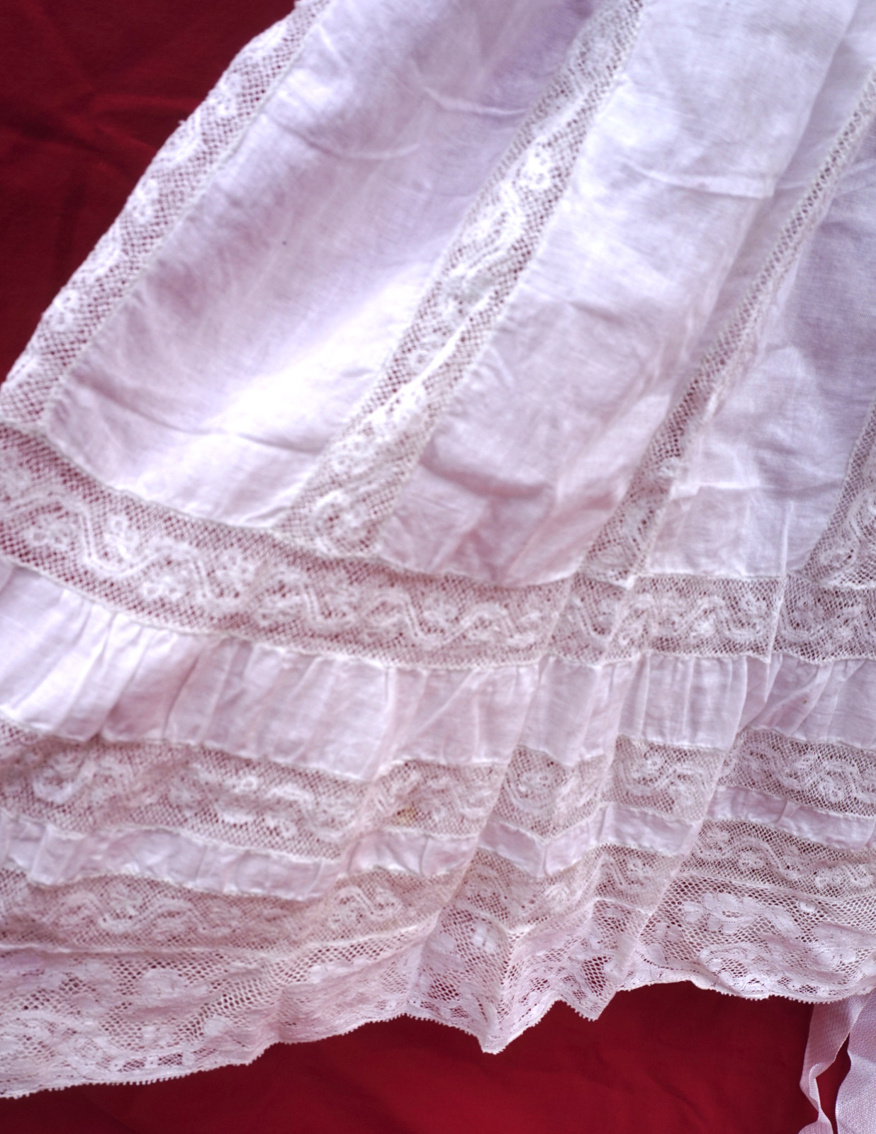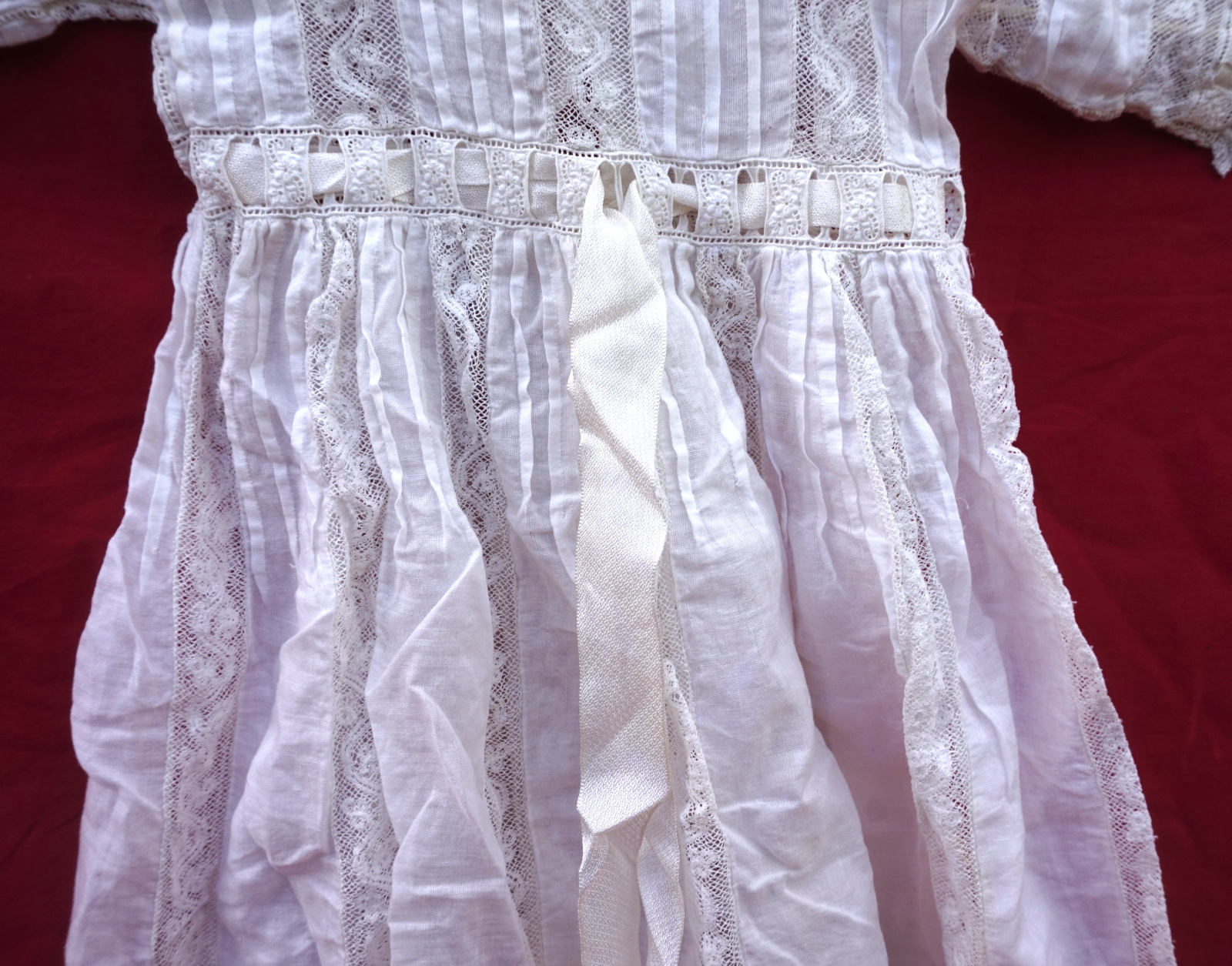 French baby christening dress with embroidery and ribbon made during the 1900's. 8 1/4" width to the shoulders 24" (61cm) length. Perfect condition.