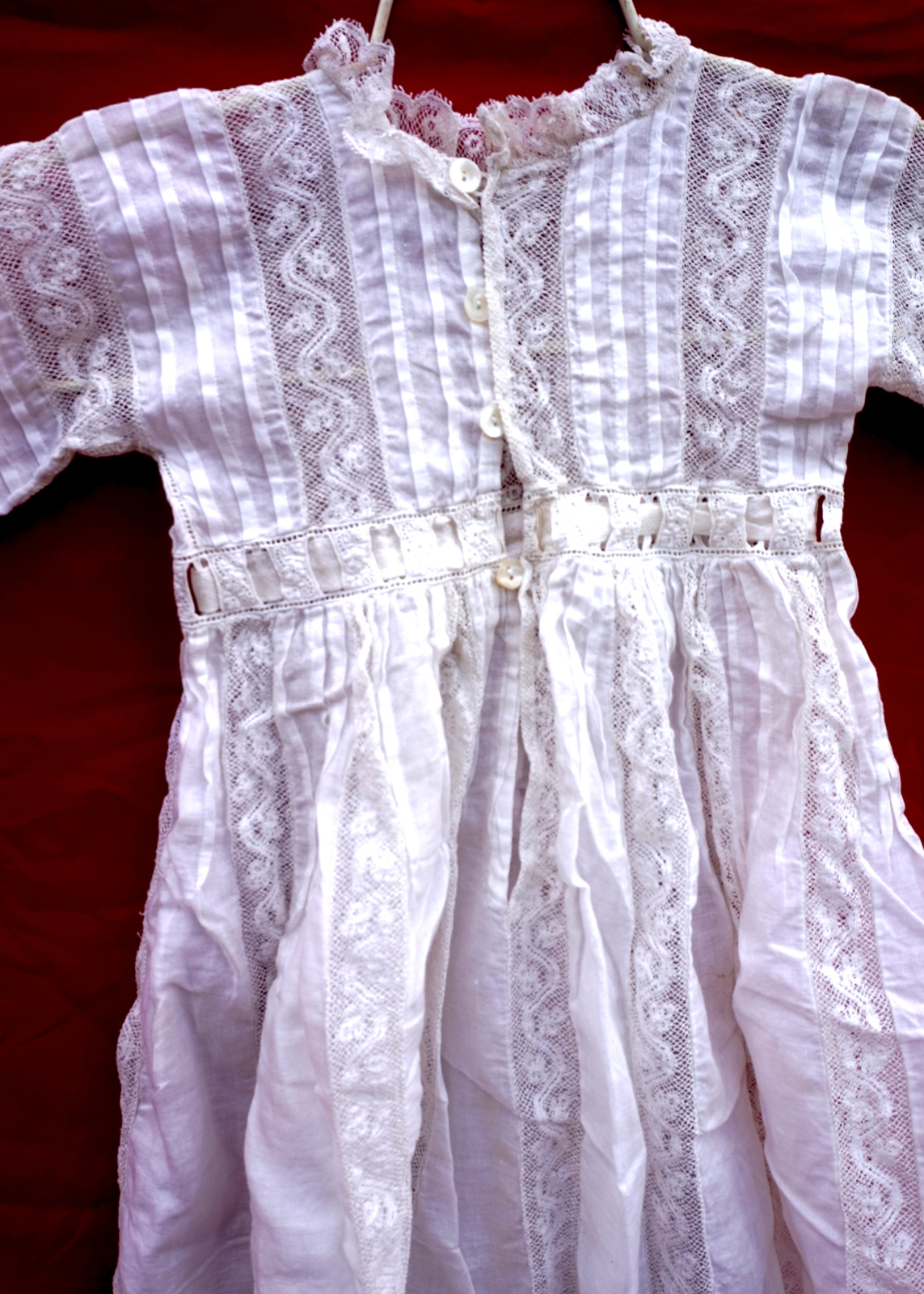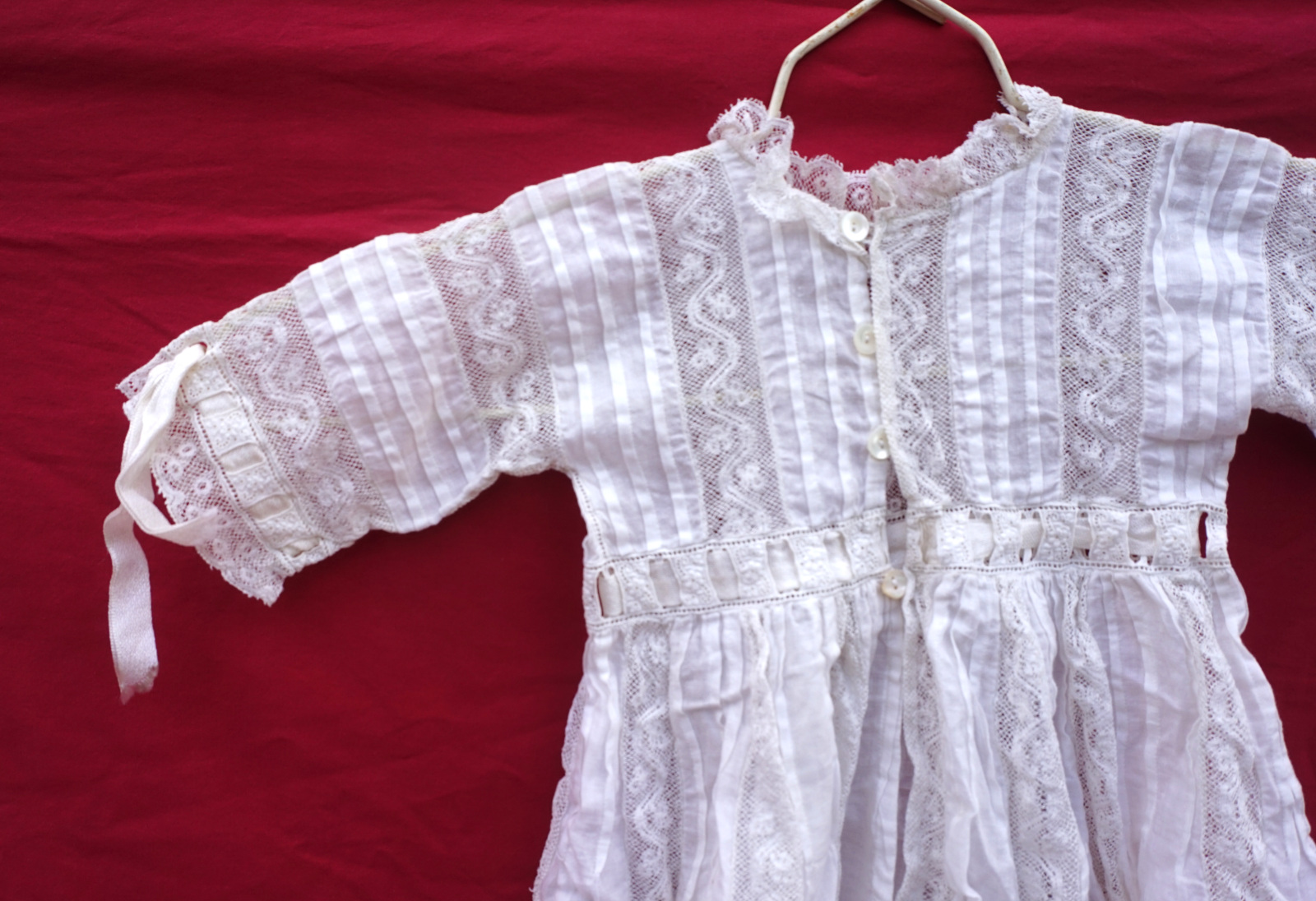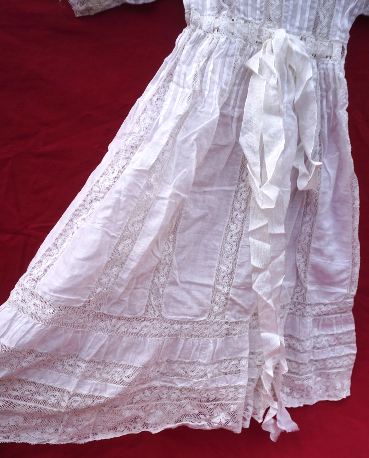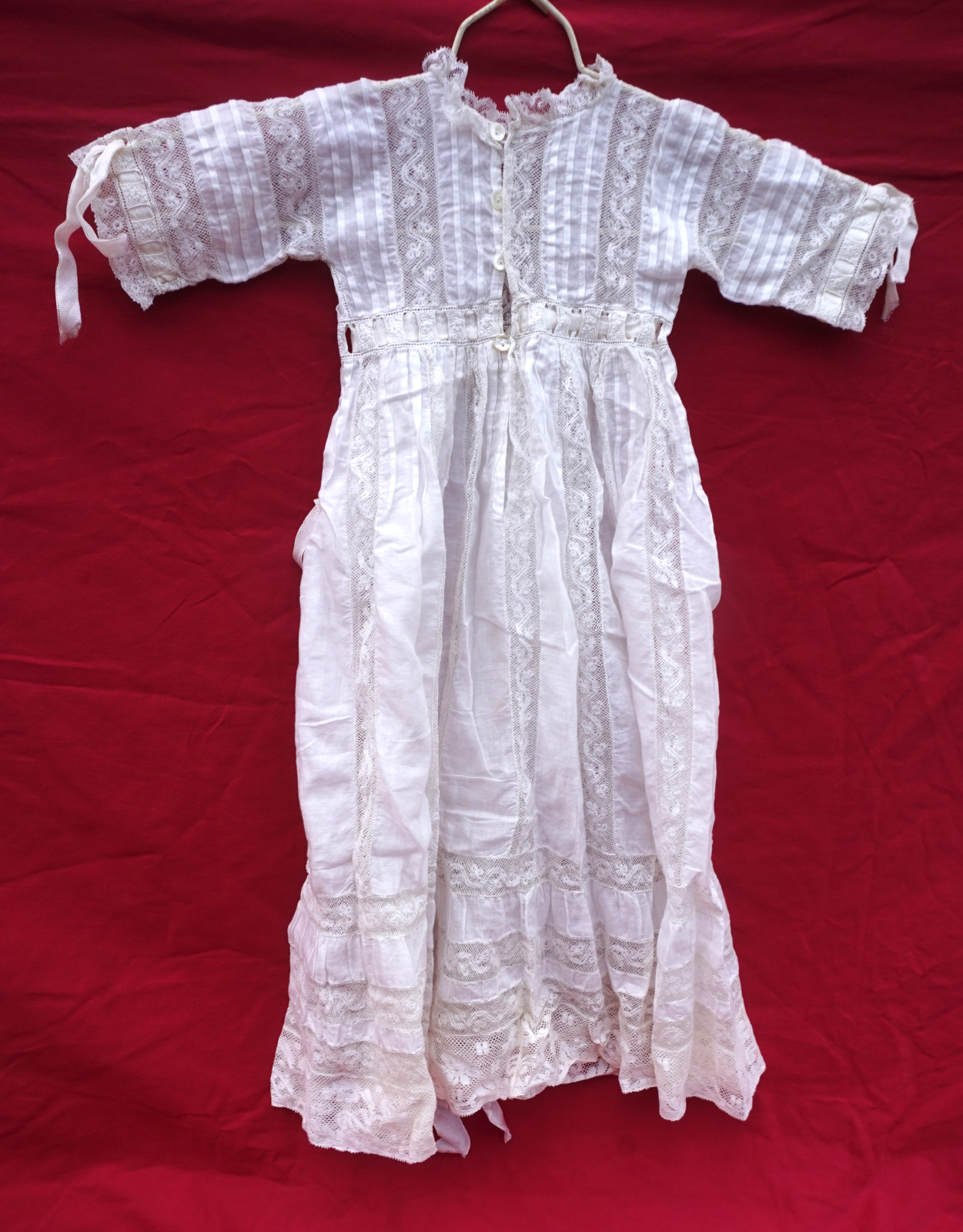 French baby christening dress with embroidery and ribbon made during the 1900's. 8 1/4" width to the shoulders 24" (61cm) length. Perfect condition.