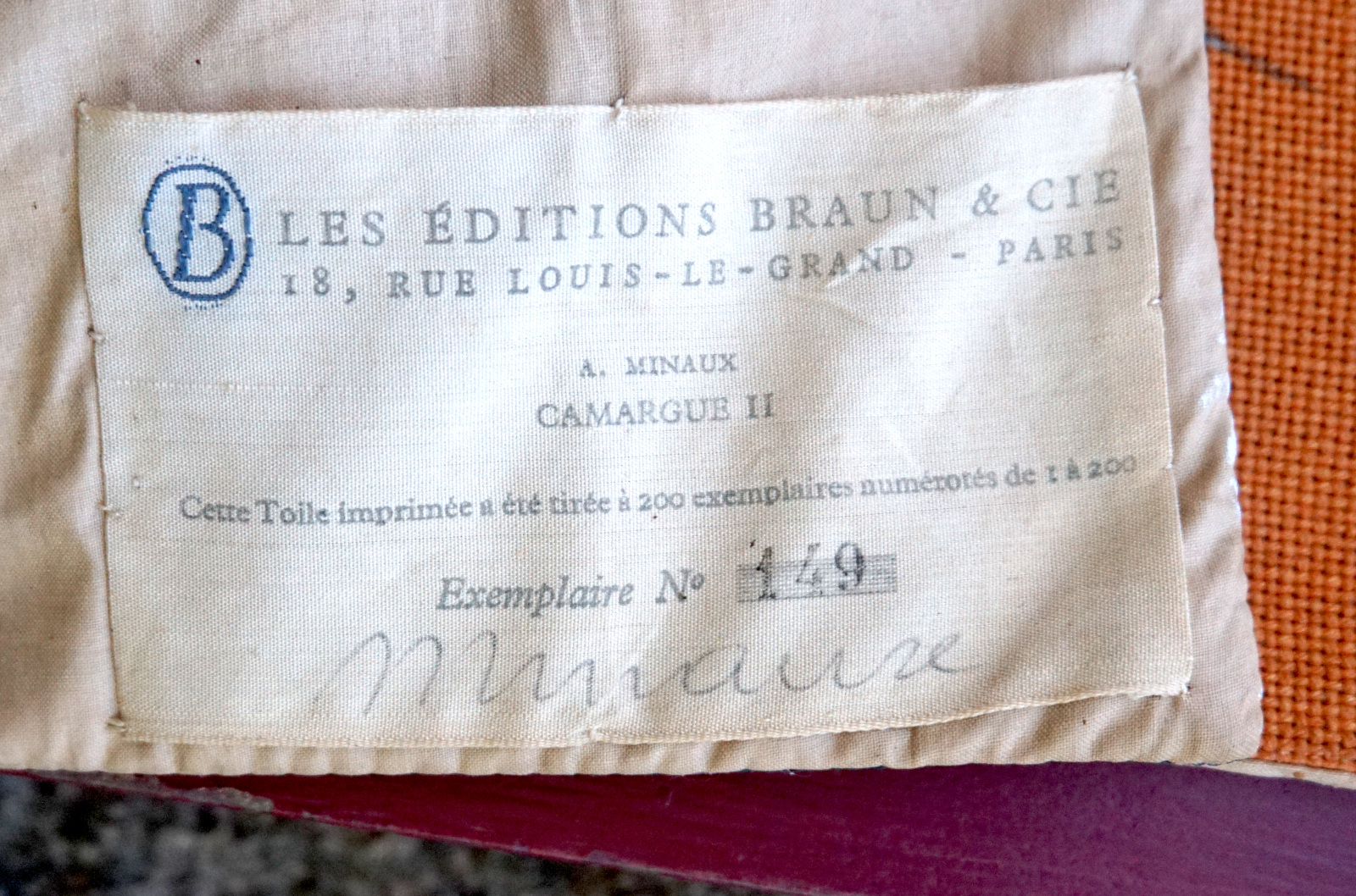 French print tapestry Camargue II by A Minaux for Editions Braun made during the 1950's. It's signed in front and on the back with the number 149/200. 64 3/4" (164.5cm) height, 46 1/2" (118cm) width. Perfect condition.