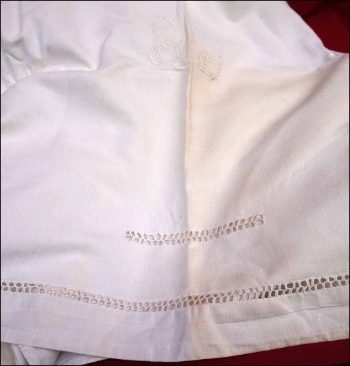 French vintage white embroidered bed sheet with garland decor and ladder work in cotton. It measures 110" (2.80 meter) length by 78 3/4" (2 meter) width. Good condition a few yellowish stains as shown by the following pictures.