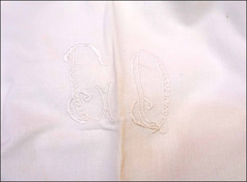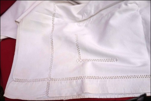 Drap en coton, brodé du monograme CD et jours échelles. Largeur 210 cm, longueur 290 cm.