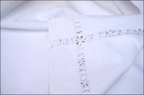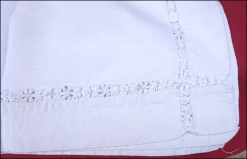 French vintage white embroidered bed sheet with decor in ladder work in metis. It measures 88 1/2" (2.25 meter) length by 78 3/4" (2 meter) width. Perfect condition as shown by the following pictures.