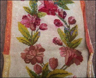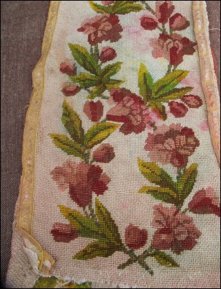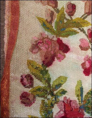 Bande de tapisserie aux petits points à décors de guirlandes de roses. Bon état pour la tapisserie, partie délavée. Longueur 140 cm, largeur 26 cm.