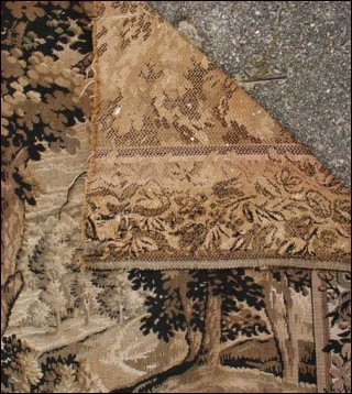 Flemish European Jacquard woven wall hanging tapestry made around 1920. Dimensions for the panel 48"1/2 width by 56" high. Not in perfect condition a few holes due to the nails as you can see on the pictures below.