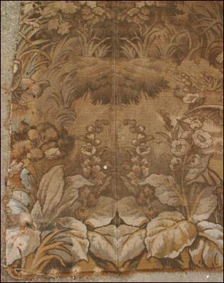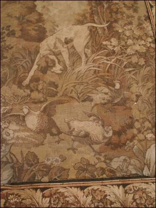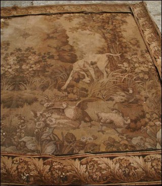 Tapisserie des Flandres "Epagneul et perdrix" sur métier Jacquard, vers 1920. Le sujet est une scène de chasse à la perdrix sur un parterre fleuri. Pour l'état, elle est née en deux parties cousues, exposée seulement en partie, trous de semences de tapissier. Hauteur 190 cm, largeur 155 cm avec une bordure.