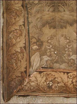 Flemish European Jacquard woven wall hanging tapestry made around 1920. Dimensions for the panel 61" width by 75 high for the border 8" width. Not in perfect condition a few holes due to the nails and a part on the left side sewing and on the bottom and the top 2 parts not exhibited less of 7"(top) 6"3/4(bottom) width as you can see on the pictures below.