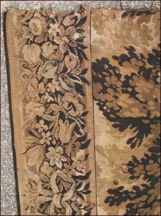Flemish European Jacquard woven wall hanging tapestry made around 1920. Dimensions for the panel 48"1/2 width by 52"3/4 high. Not in perfect condition a few holes due to the nails as you can see on the pictures below.