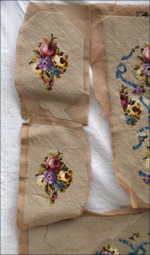 Tapisseries de laine, bouquet et guirlandes, entièrement fait main pour fauteuil à l'Artois. Dimensions: grand panneau 82,5 cm par 70 cm, petit panneau 51 cm par 45 cm, accotoirs 17 cm par 27 cm. Parfait état.
