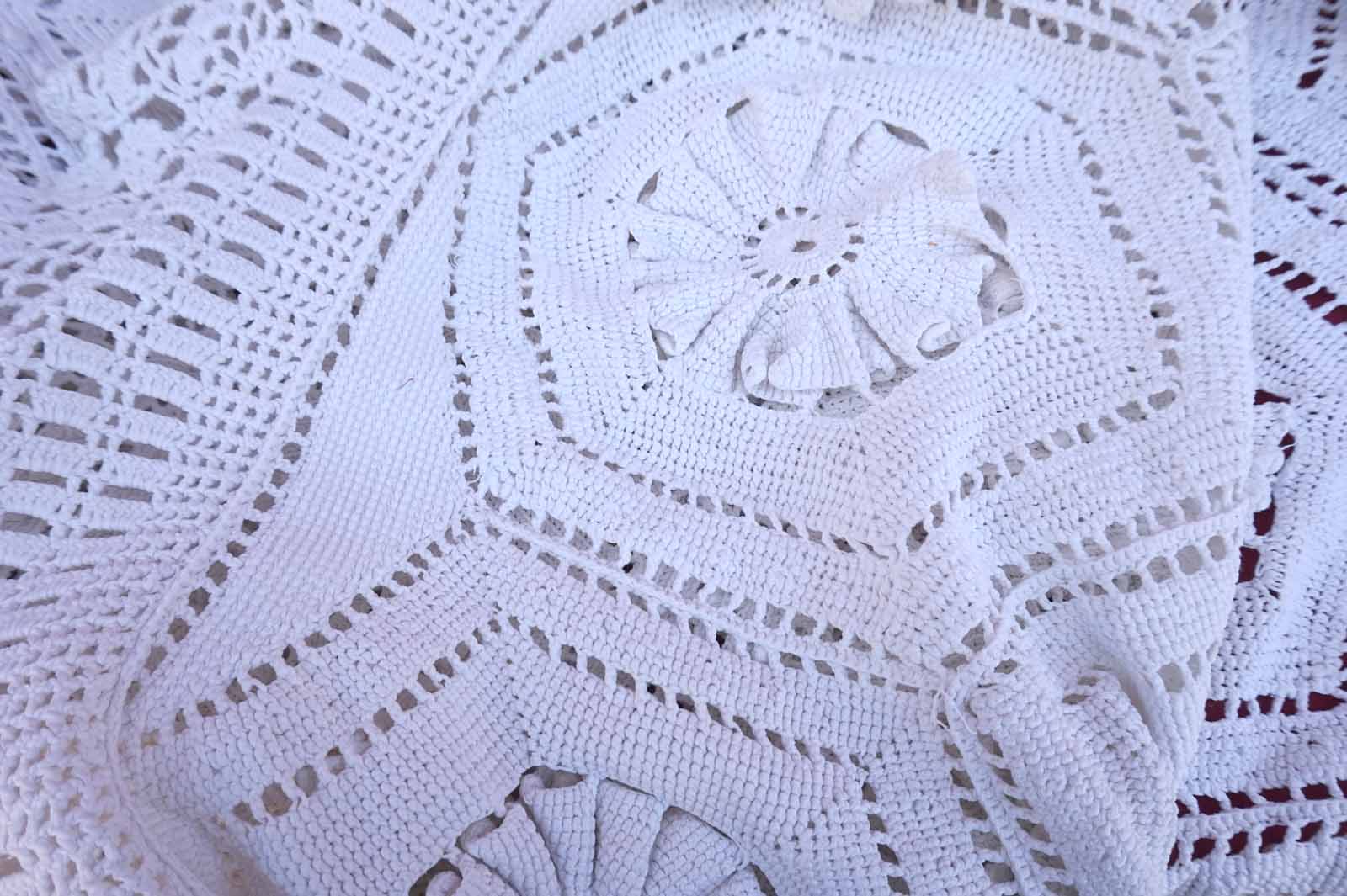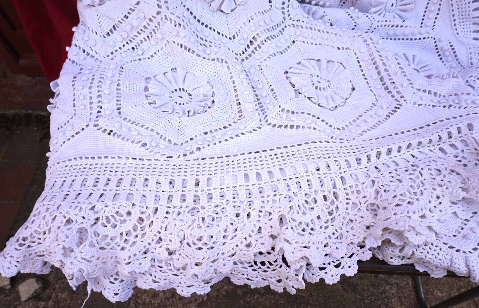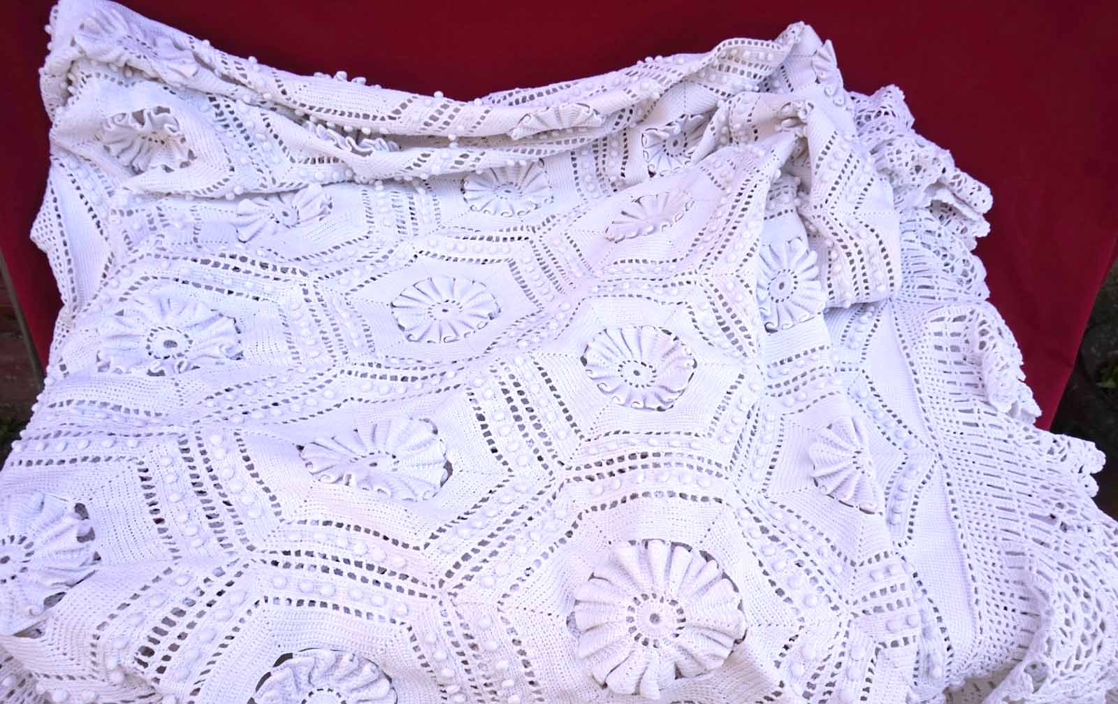 Dessus de lit en tricot en coton blanc, vers 1930. 240cm par 185cm. Bel état, quelques points manquants et petites taches.