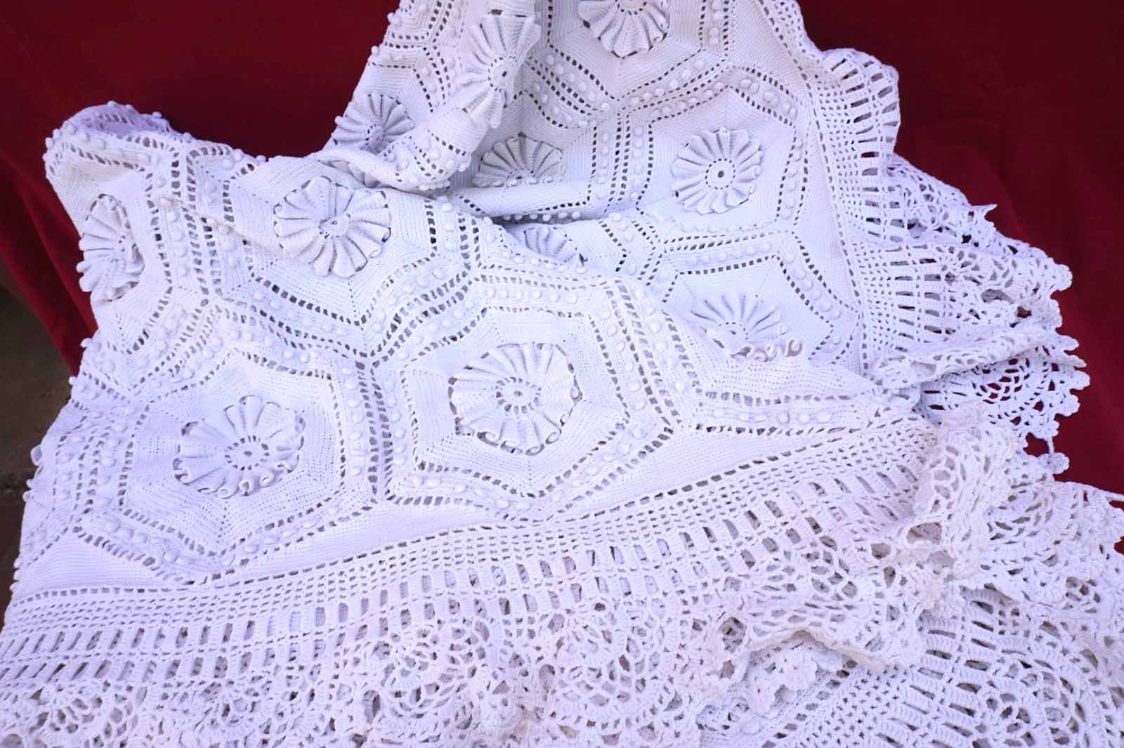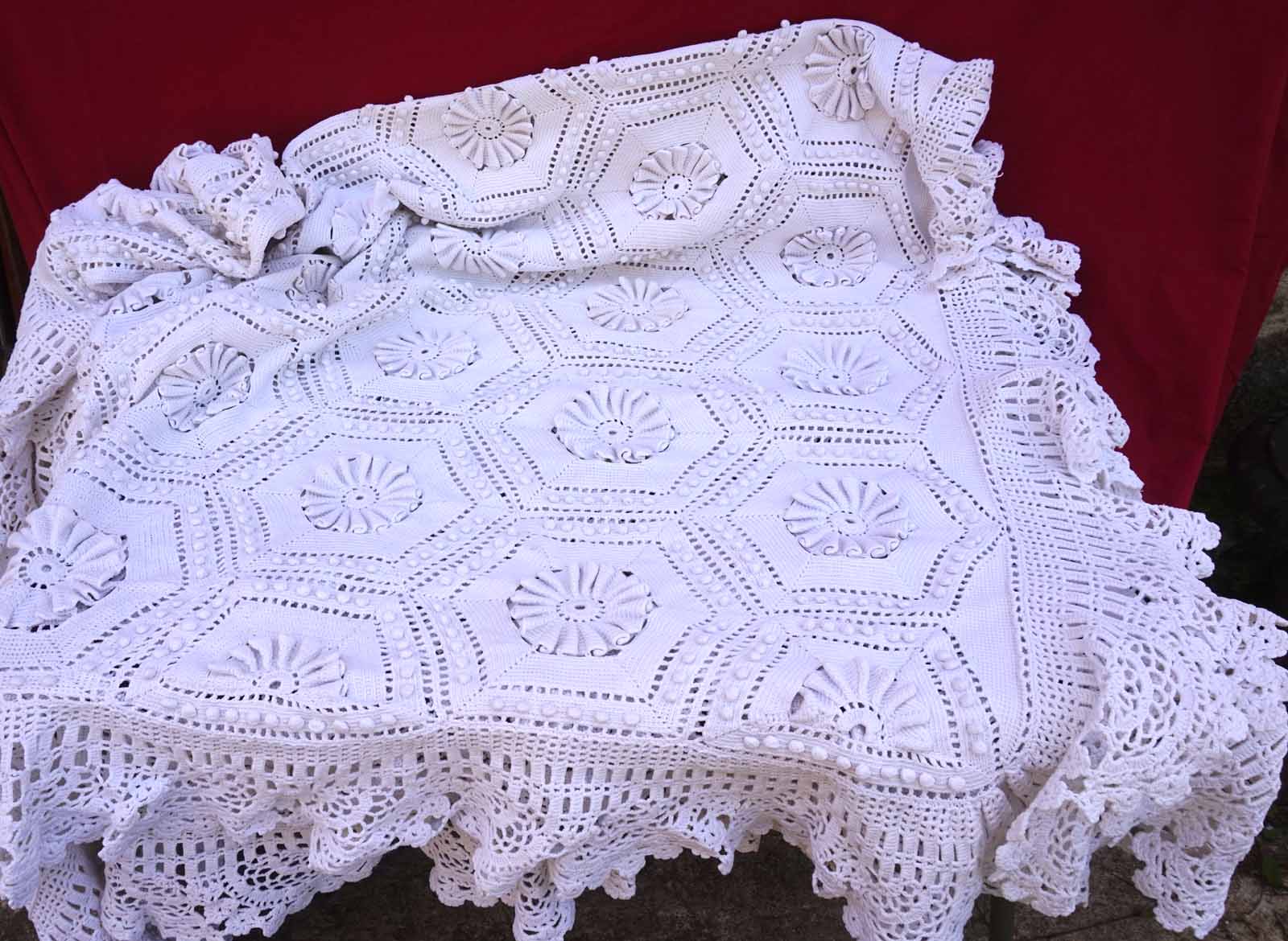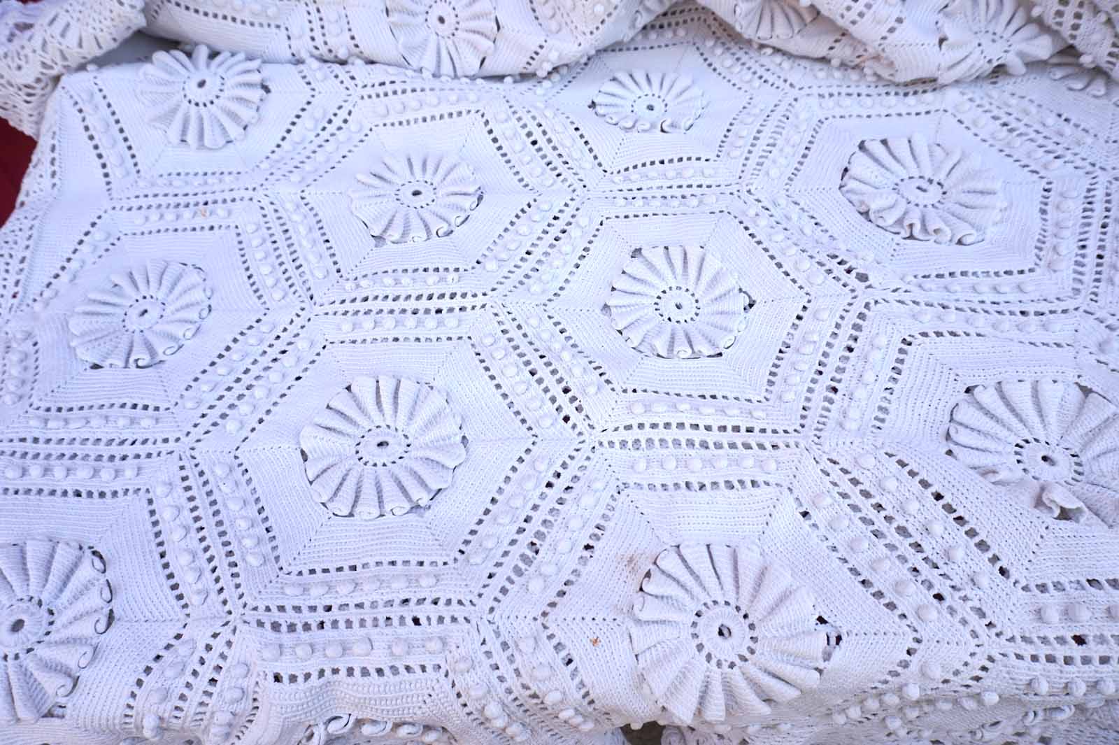 Dessus de lit en tricot en coton blanc, vers 1930. 240cm par 185cm. Bel état, quelques points manquants et petites taches.