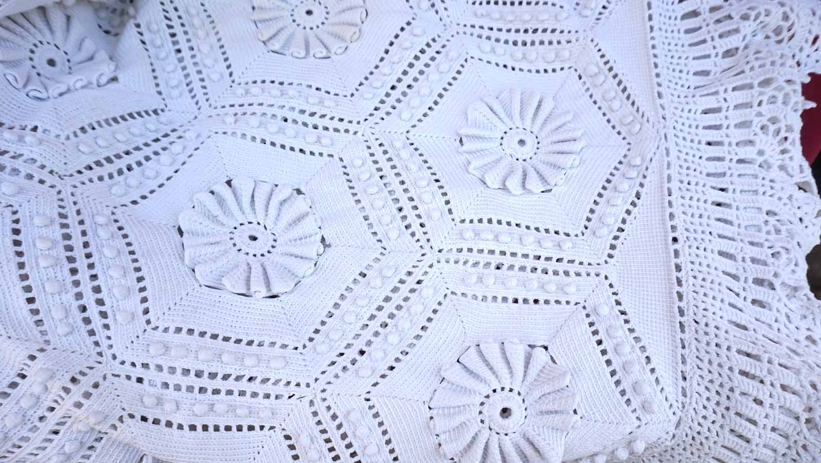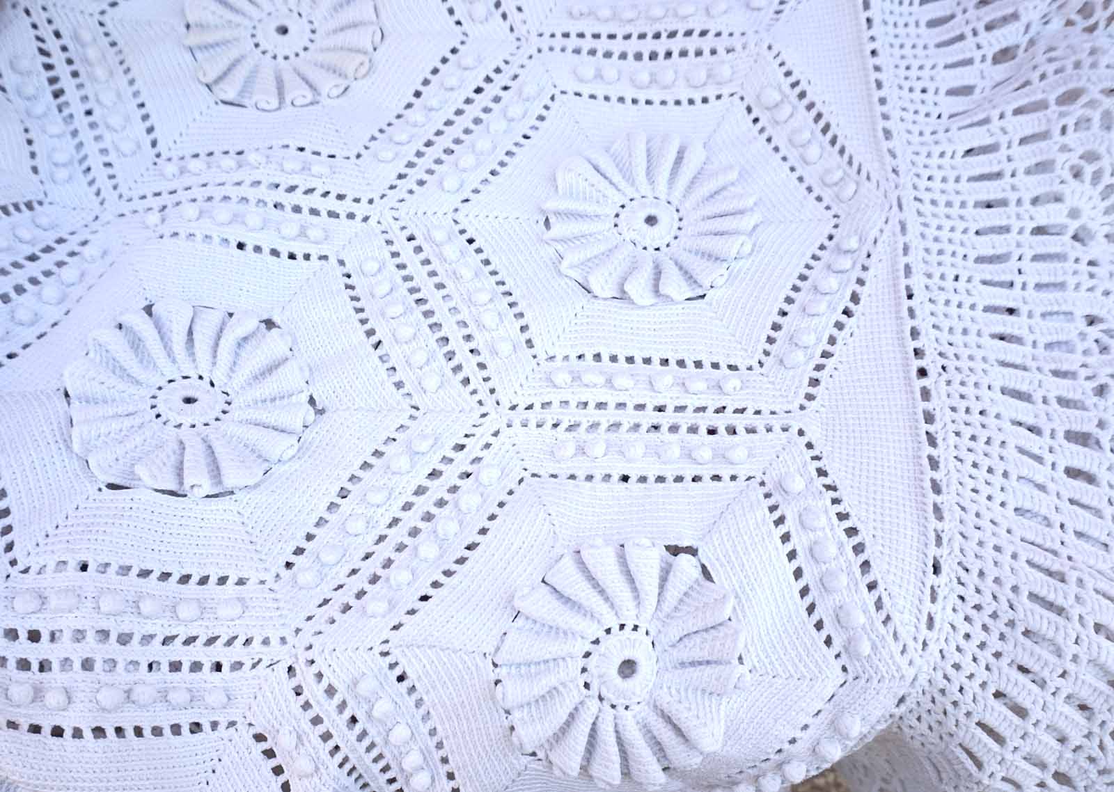 French Hand-Made Knit Off-White Cotton Bed Cover Coverlet 94x72 inches
