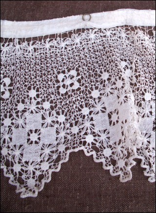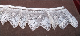 For our French-speaking friends Rideau de fenêtre ou d'étagère en dentelle au filet, vers 1900. Bon état. Longueur 1.12 cm, largeur 21 cm.