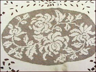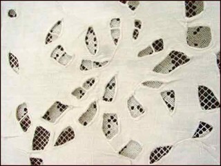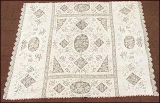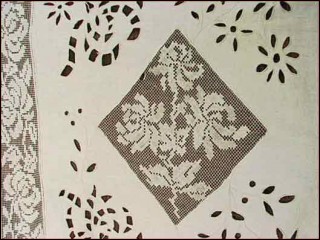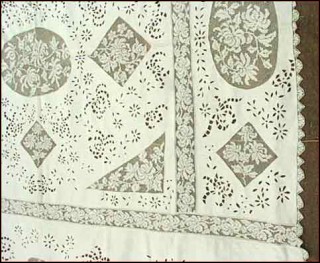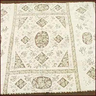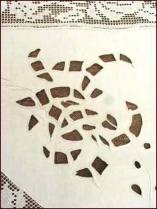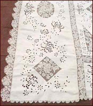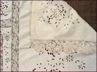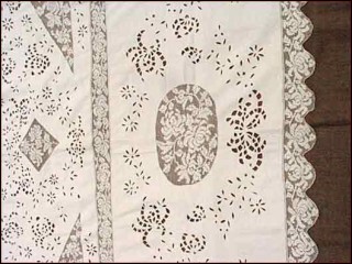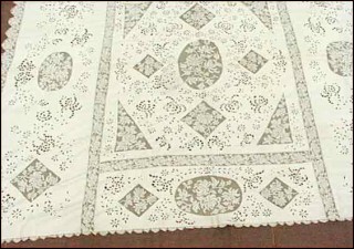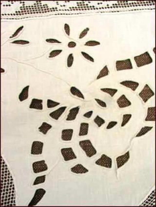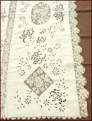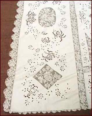 This large table cloth 95" by 79" in pure linen has been made around 1900. It's entirely hand embroidered with Richelieu cutwork and inlayed with machine-made lace pieces. Perfect condition only 1 small hole in machine-made lace like you can see on the picture below.