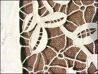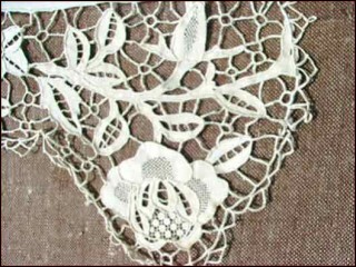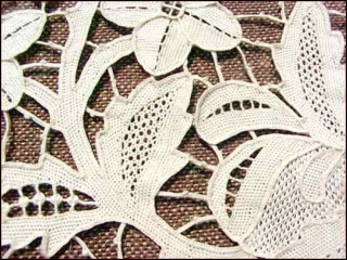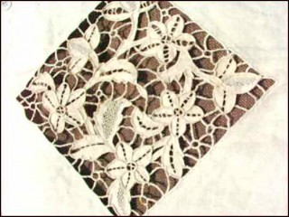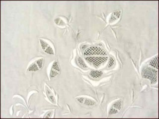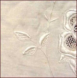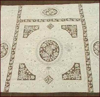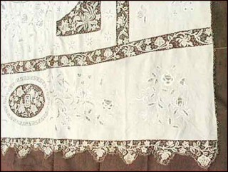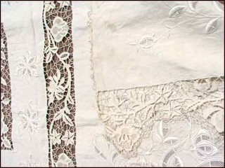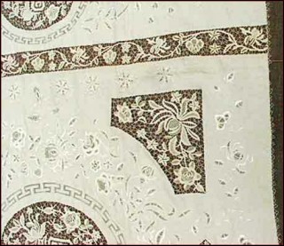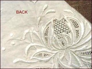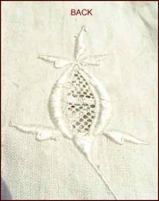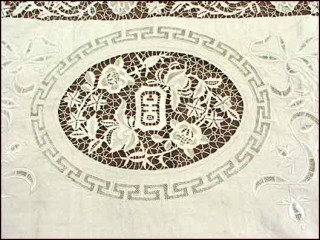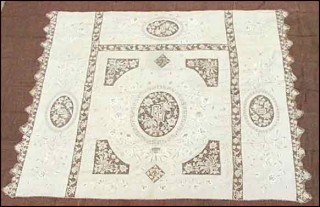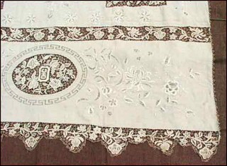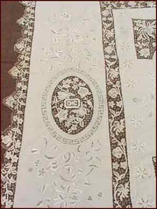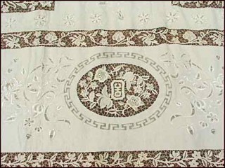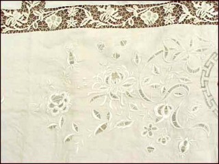 This large tea cloth 97" by 80" in pure linen has been made around 1900. It's in mint condition never washed with original starching. It's entirely hand embroidered with Bourdon stitch and inlayed with hand needle lace pieces. Perfect condition only some small rust stain.