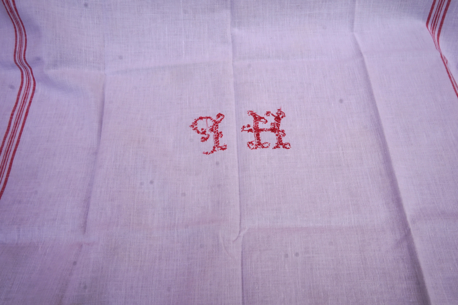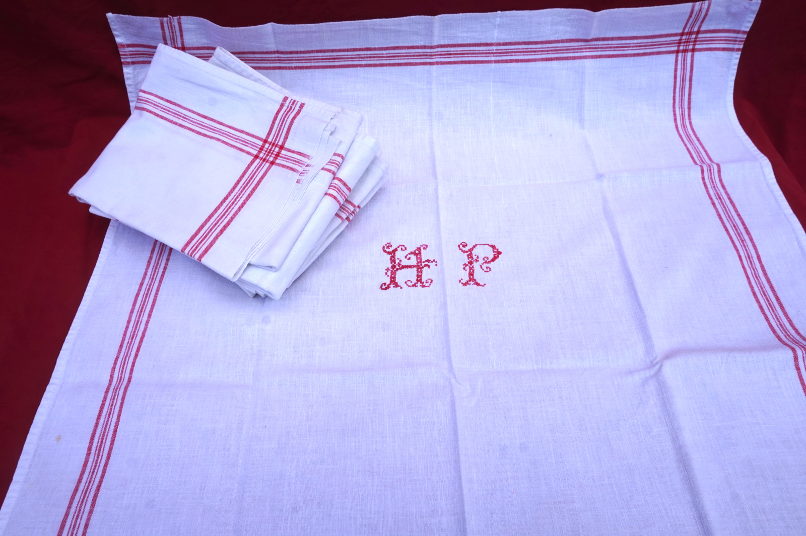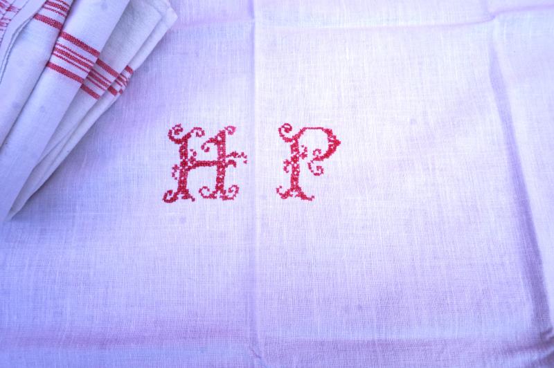 French linen set of 8 tea towels with red stripes and embroidered HP monogram made during the 1930's. 25" (63.5cm) by 22 3/4" (58cm). Beautiful condition tiny rust stains.