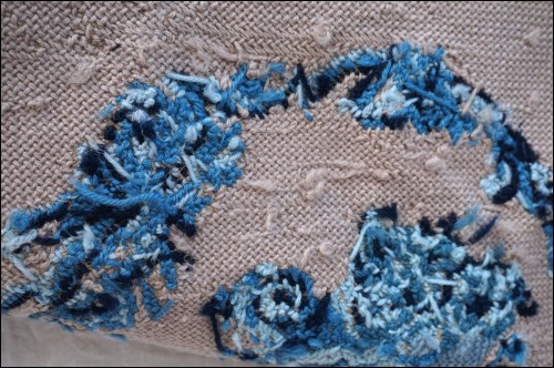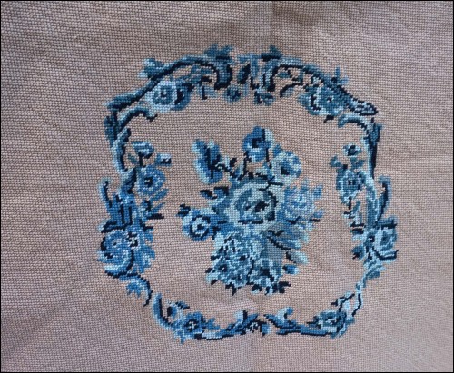 Bouquet et couronne de fleurs, en camaïeu de bleus,tapisserie pour siège ou coussin entièrement fait main sur une toile de Margot Paris. Dimensions du travail 58 cm par 54,5 cm.