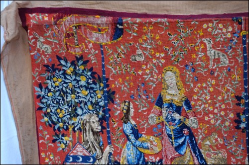 Tapisserie fait main d'après "La Dame à la Licorne" musée de Cluny sur un canevas de Royal Paris. Dimensions pour le panneau: 130cm par 90cm, pour la tapisserie largeur 106cm, hauteur 77.5cm. Très bel état.