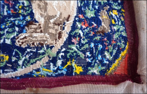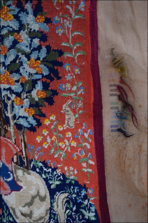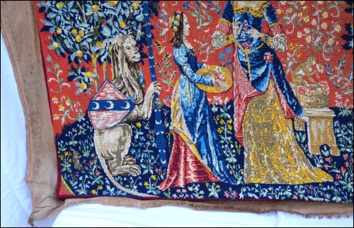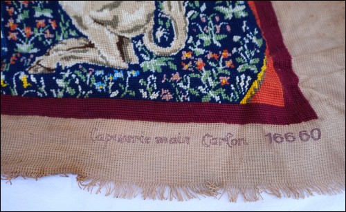French needlepoint tapestry " The Lady with the Unicorn" from tapestry of Cluny Museum made during the mid-century. 37 3/4" (106cm) width by 30 1/2" (77.5cm) width for the tapestry and 51" by 35 1/2" for the canvas panel. It's stamped Royal Paris and numered 166 60as shown by the following pictures.