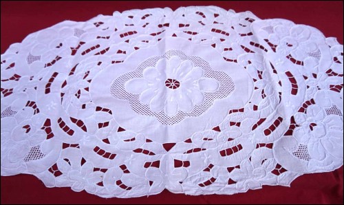 Napperon ovale en broderie. Longueur 74 cm, largeur 40 cm. Bel état, 3 petits trous voir photos.