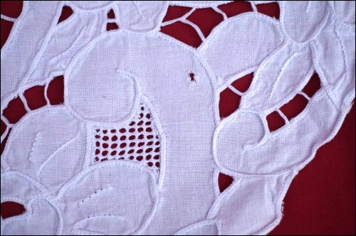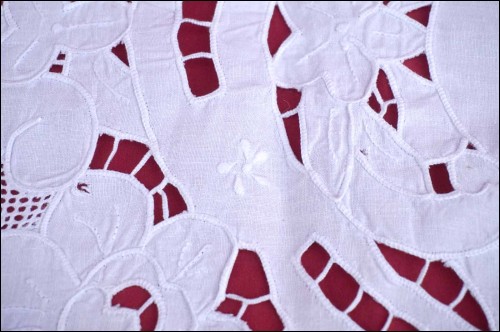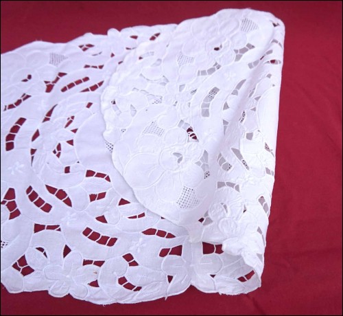 French embroidered cutwork table runner showing flowers made in France during the 1930's. 29 1/8" (74cm) length by 15 3/4" (40cm) width. Good condition, 3 small holes as shown by the following pictures.