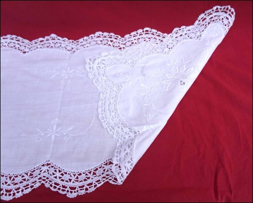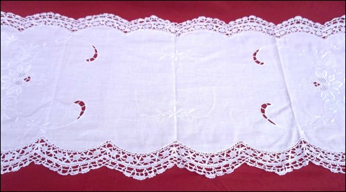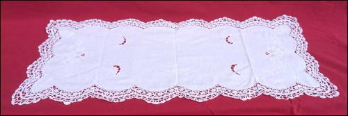Centre de table rectangulaire, brodé et orné de dentelles. Longueur 82 cm, largeur 35 cm. Très bel état.