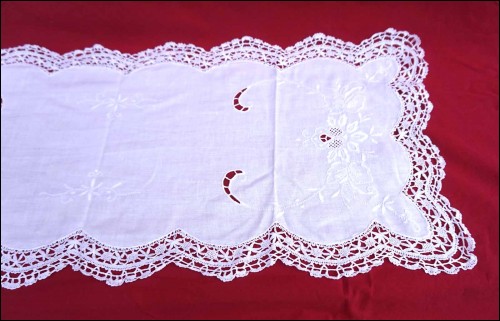 French embroidered cutwork table runner showing flowers made in France during the 1930's. 32 1/4" (82cm) length by 13 3/4" (35cm) width. Perfect condition, as shown by the following pictures.