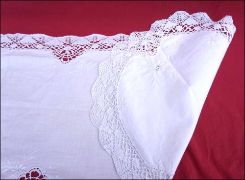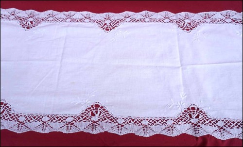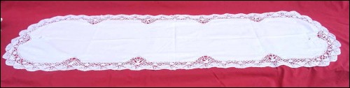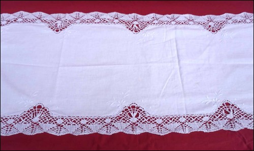 Centre de table brodé et orné de dentelles. Longueur 120 cm, largeur 35 cm. Très bel état.